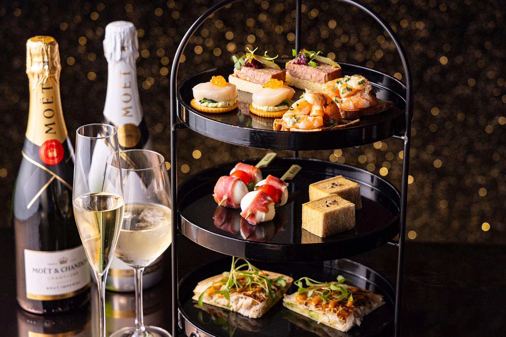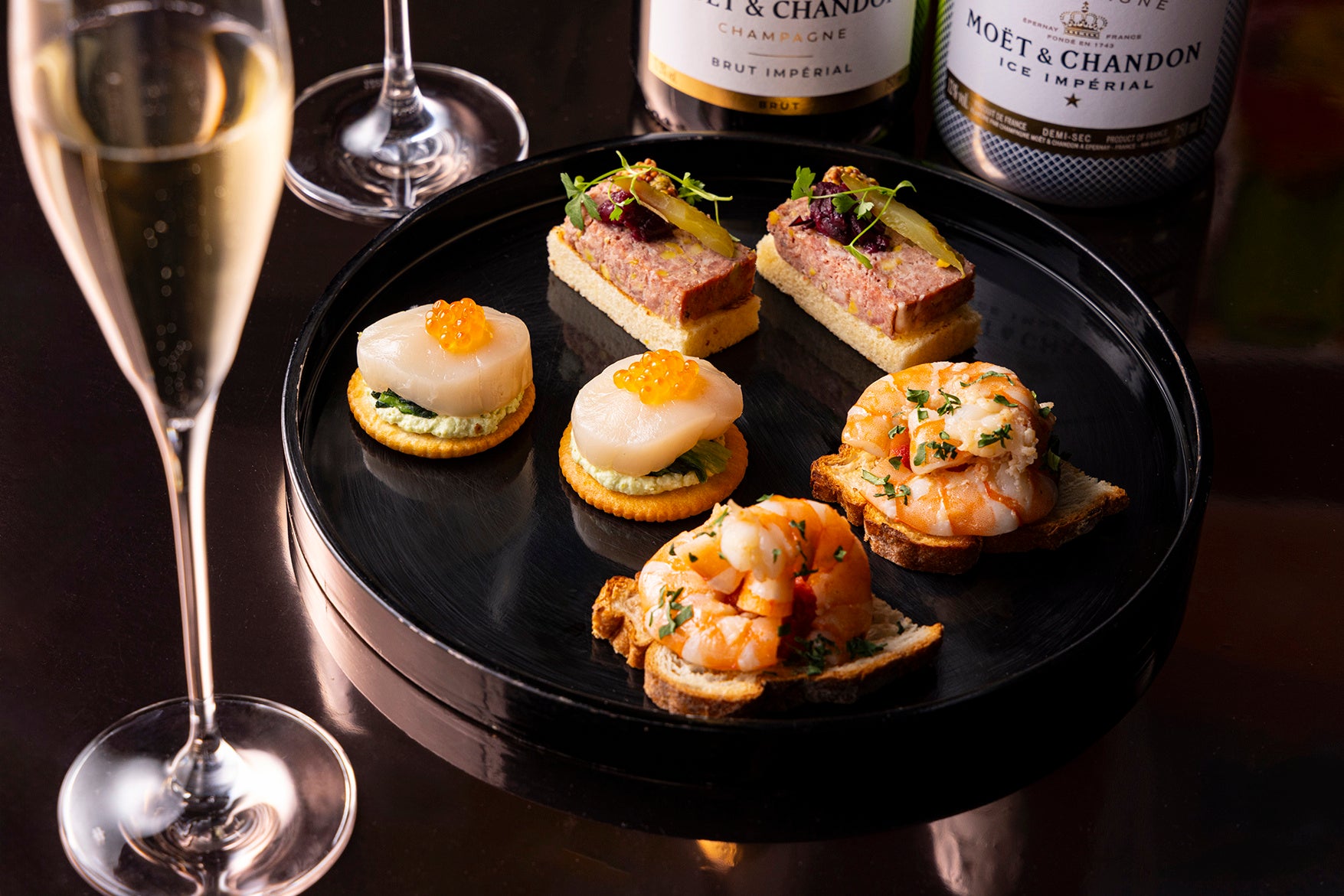 世界各国からゲストが集うプルマン東京田町のルーフトップバー「PLATFORM 9」。山手線の9番線を想起させるその名の通り、人と人、文化と文化が交差するグローバルな空間で、今夏は “五感で旅するサマーエスケープ” をテーマに、世界各地にインスピレーションを得たセイボリーとシャンパンを掛け合わせるフードペアリングが登場します。フリーフローで贅沢に味わうシャンパンやワインとともに、イタリアの生ハム、マスタードをピリッと効かせた国産平飼い卵のだし巻き、そしてメキシコのチキンケサディーヤなど、一口ずつ世界を旅するセイボリーを、3段のスタンドに6種類ご用意しました。それぞれの料理が、モエ・エ・シャンドンの泡と出会い、旅するように鮮やかなストーリーを生み出します。