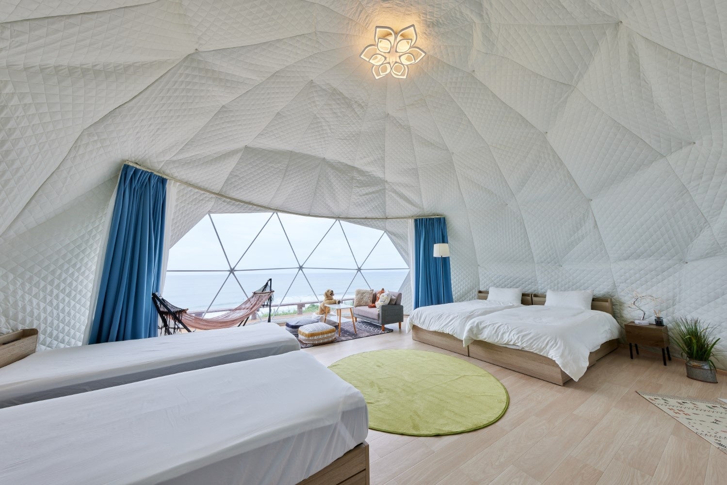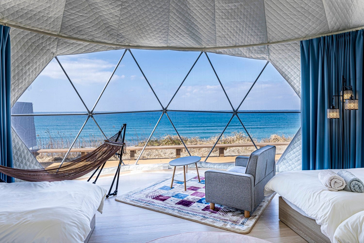 東シナ海の青い海を一望できる絶景スポットに立ち並ぶ、全5棟のドームテント。
