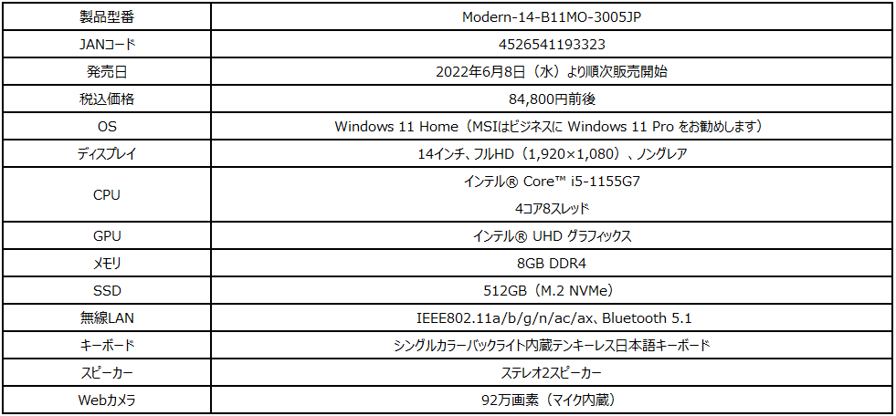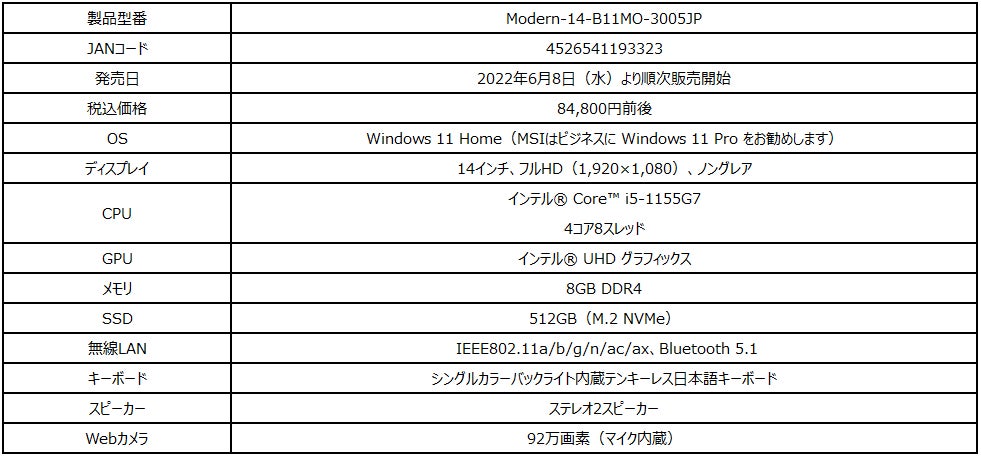 この度、エムエスアイコンピュータージャパン株式会社は、薄さ18.1mm・軽さ1.3kgの本体にビジネス&テレワーク向けの機能を備えた薄型・軽量ビジネスノートPCのTSUKUMO限定モデル「Modern-14-B11MO-3005JP」を2022年6月8日(水)より販売開始いたします。