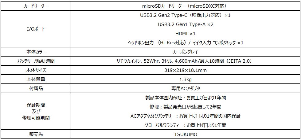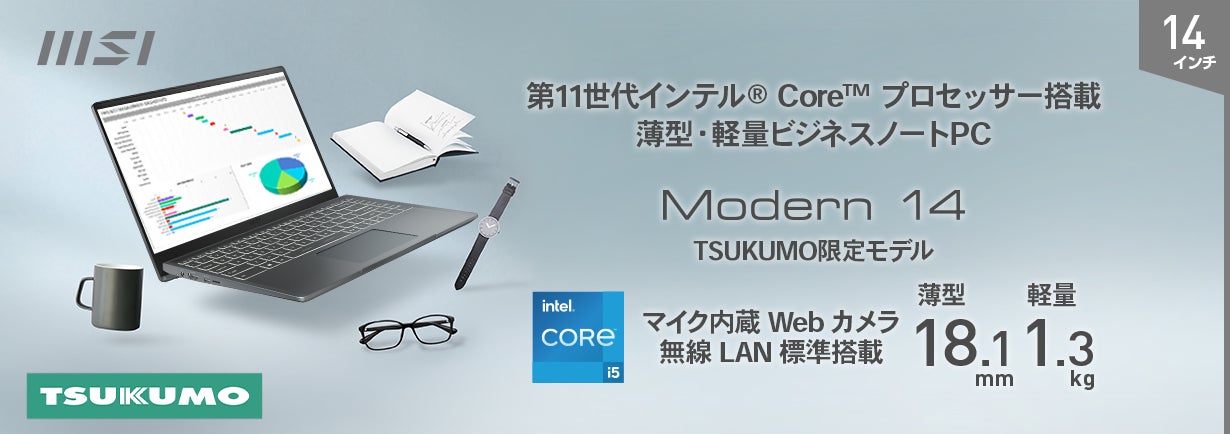 ビジネス&テレワーク向け機能を備えて税込9万円以下 薄さ18.1mm・軽さ1.3kgの薄型・軽量ビジネスノートPC TSUKUMO限定モデル「Modern-14-B11MO-3005JP」発売