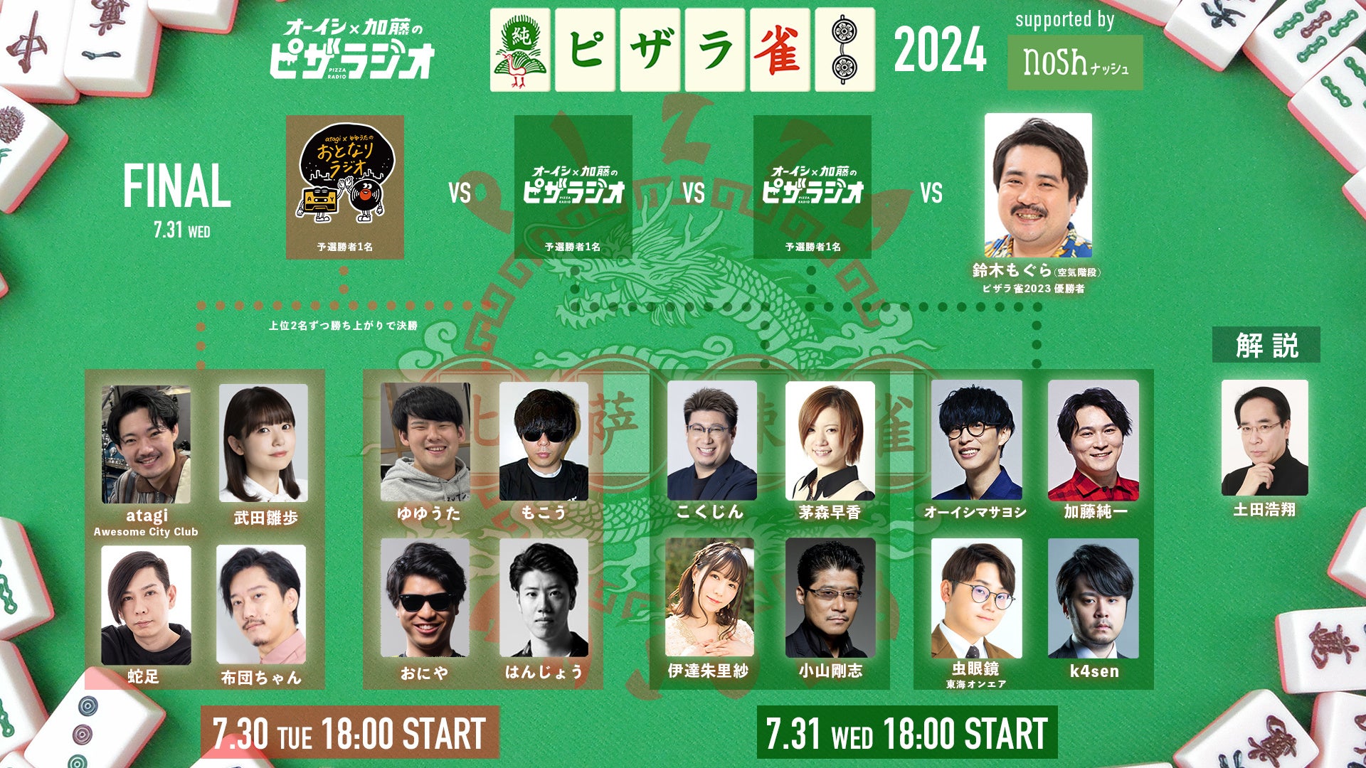 ピザラ雀とは・・オーイシ✕加藤のピザラジオ(ピザラジ)が毎年夏に開催している大人気麻雀生放送。今回はピザラジの姉妹番組であるatagi✕ゆゆうたのおとなりラジオ(おとラジ)が参戦!