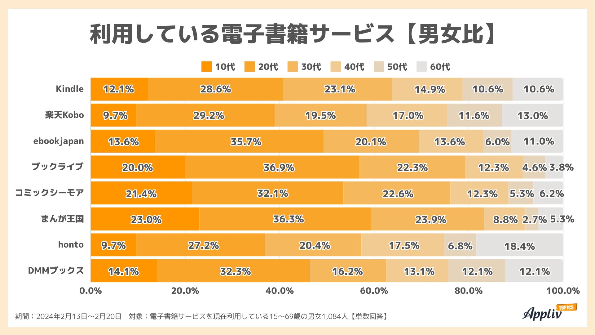 一方、「honto」、「楽天kobo」、「Kindle」、「DMMブックス」などオールジャンルを幅広く扱っているサービスは30代以上の利用者が多いようです。