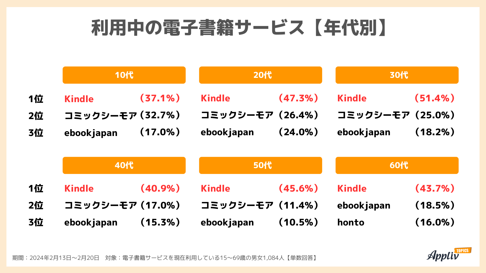 また10~50代に人気のサービスTOP3は、いずれも「Kindle」「コミックシーモア」「ebookjapan」でした。