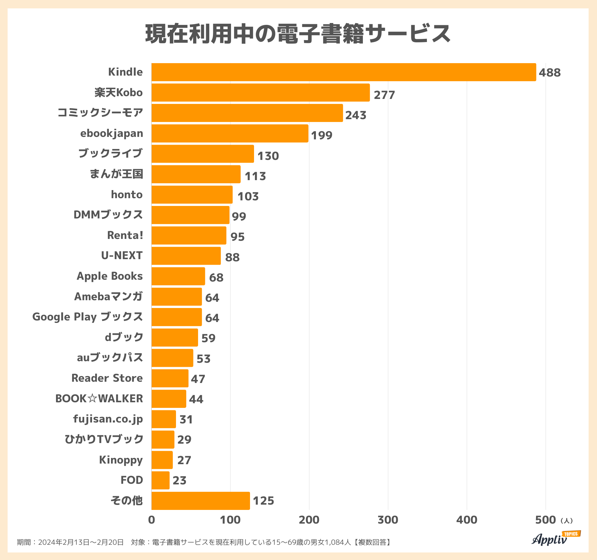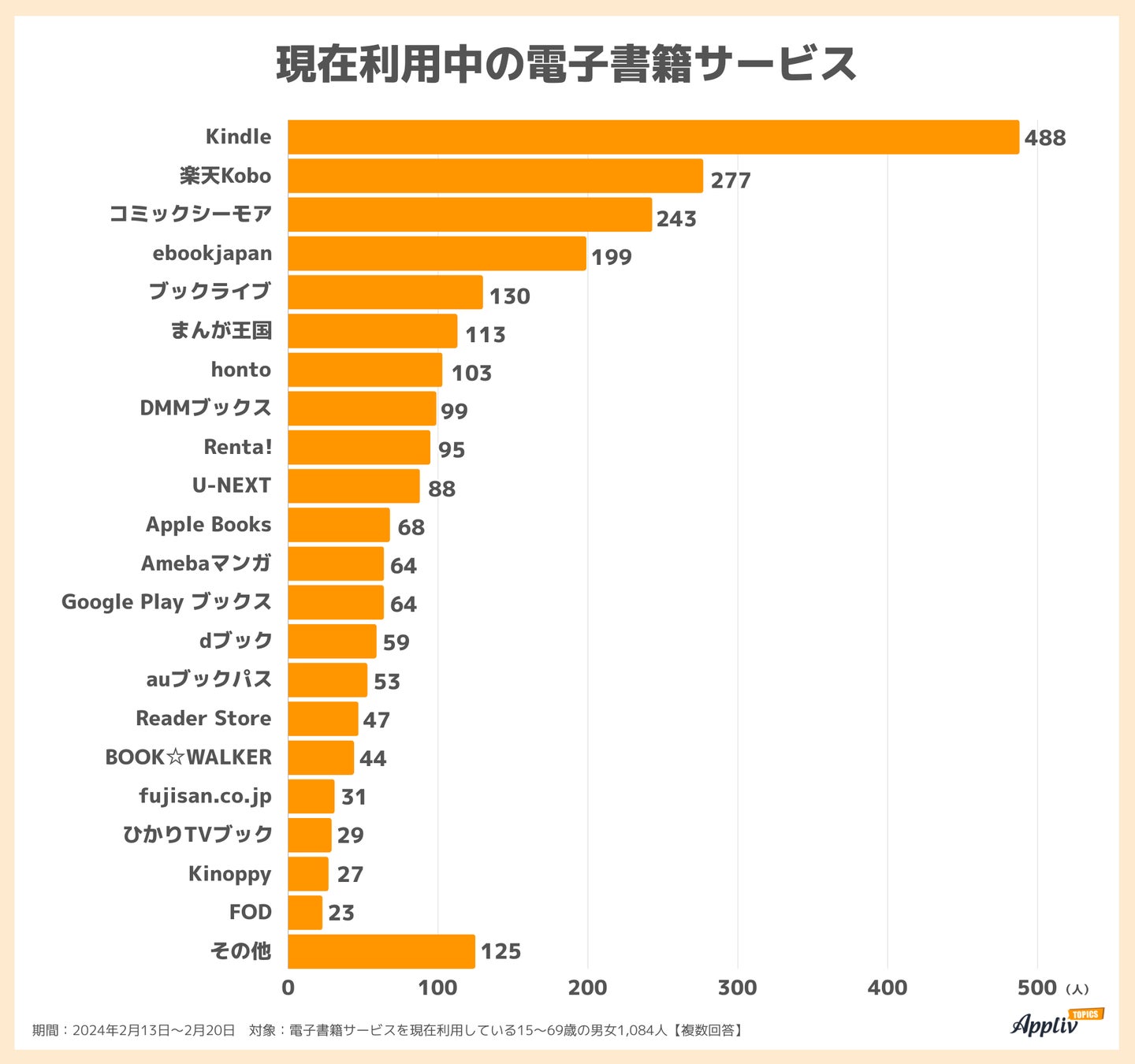 現在利用中の電子書籍サービスを調査すると、1位「Kindle(488人)」、2位「楽天Kobo(277人)」、3位「コミックシーモア(243人)」という結果でした。