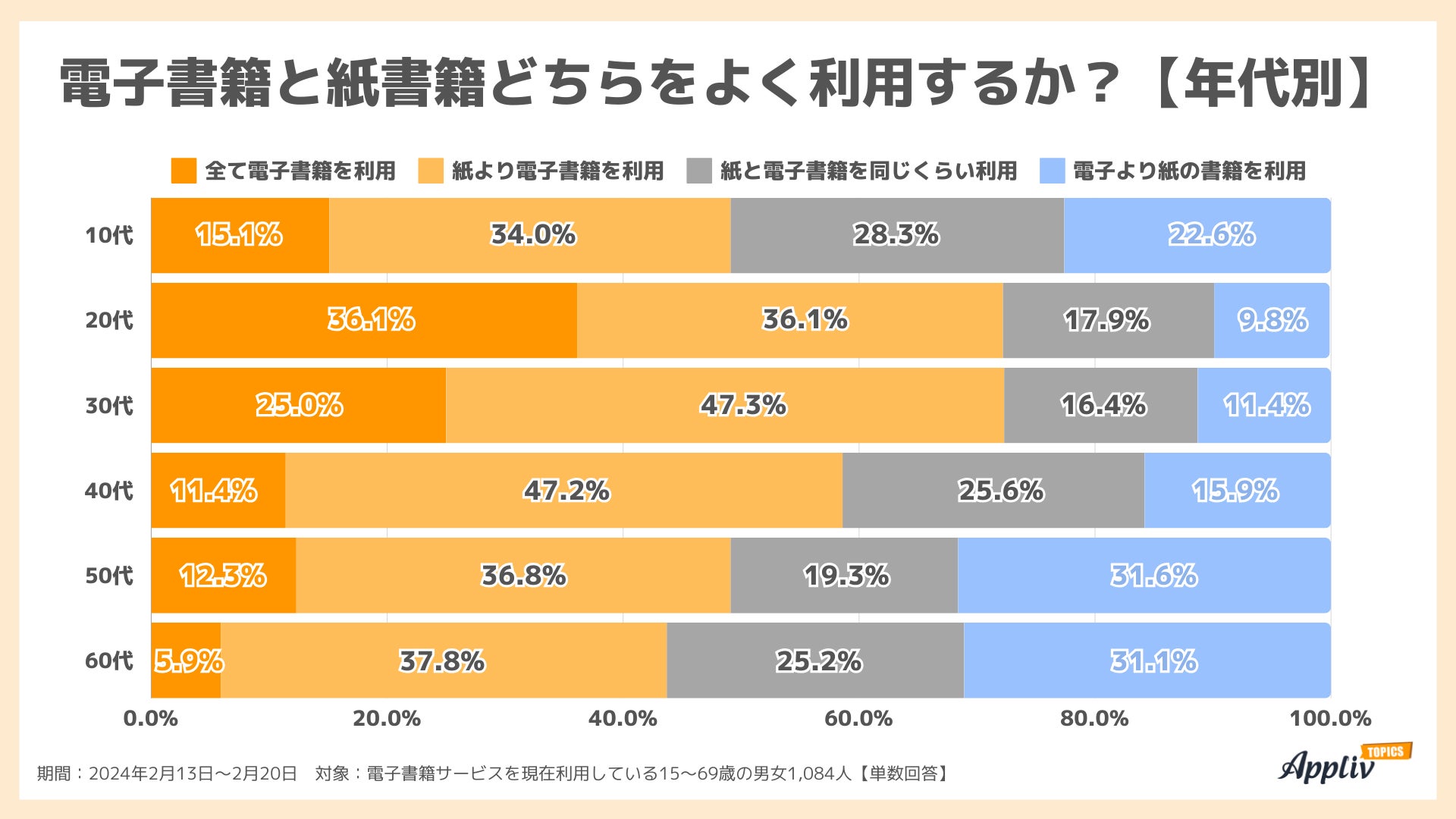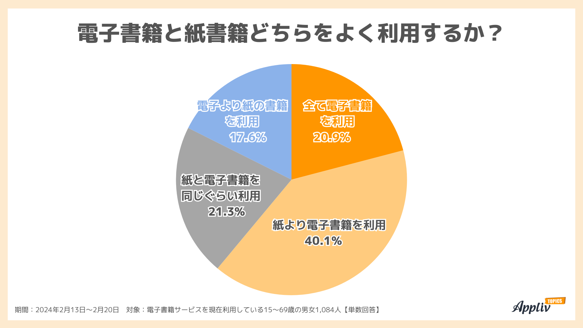 電子書籍と紙の書籍のどちらをよく利用するか聞いてみると、「紙の書籍より電子書籍をよく利用する(40.1%)」が最も多く、次いで「電子書籍と紙の書籍は同じくらい読む(21.3%)」、「全て電子書籍を利用する(20.9%)」でした。