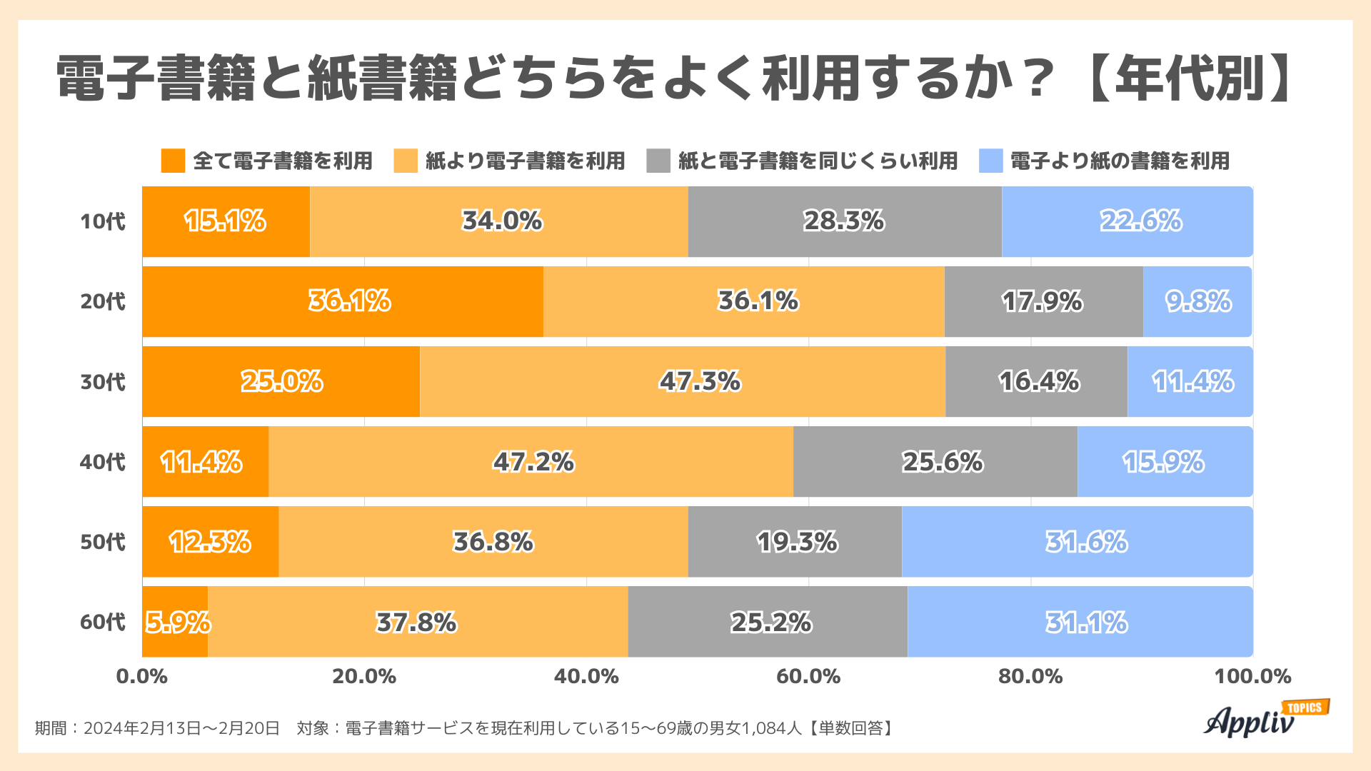 年代別に見てみると、全て電子書籍で読んでいる人の割合は30代が最も多く、20代、10代と続きます。