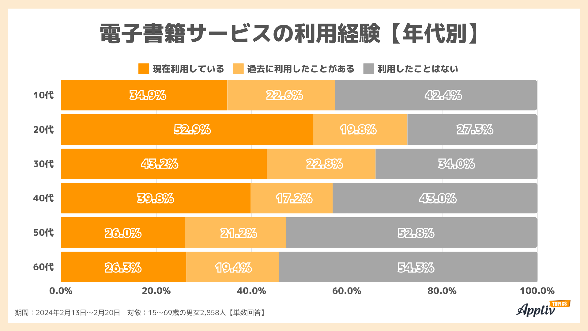 電子書籍を現在利用中の人は37.9%、最多は20代、年代が上がるにつれ利用経験率は減少