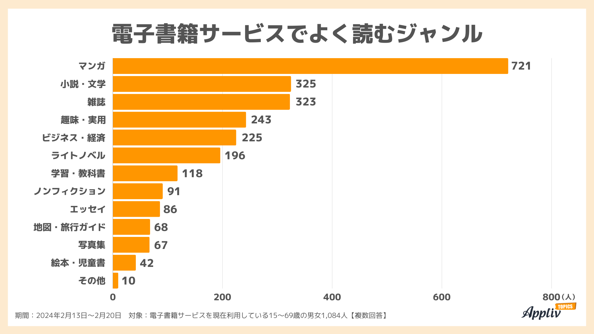 電子書籍を現在利用していると回答した1,084人に、サービス内でよく読むジャンルを尋ねると、最も多いのは昨年調査と同じく「マンガ」で721人、次いで「小説・文学(325人)」、「雑誌(323人)」でした。