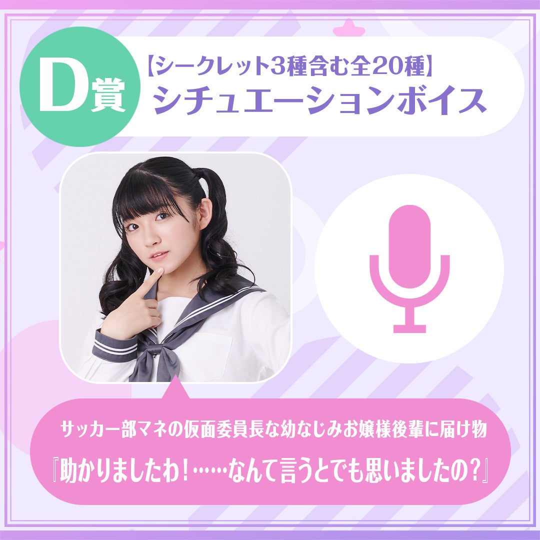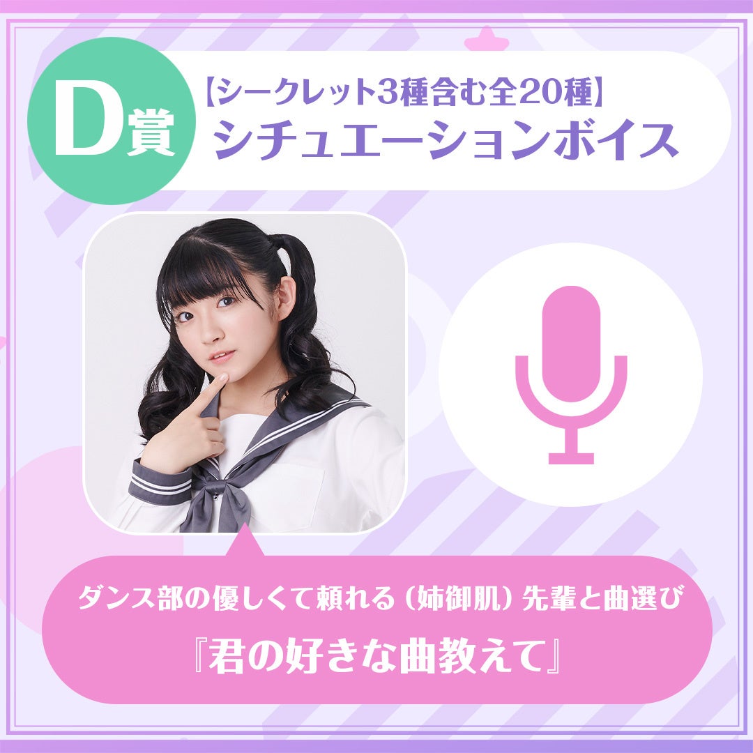 各くじにおけるA賞は、進藤あまねさんと1対1でのオンラインお茶会参加権。B賞は、サイン入りチェキ。C賞は、あなたのお名前が入ったあなたに向けてのシチュエーションボイス。D賞には、シークレットのボイス3種を含む全20種類のシチュエーションボイスとなります。