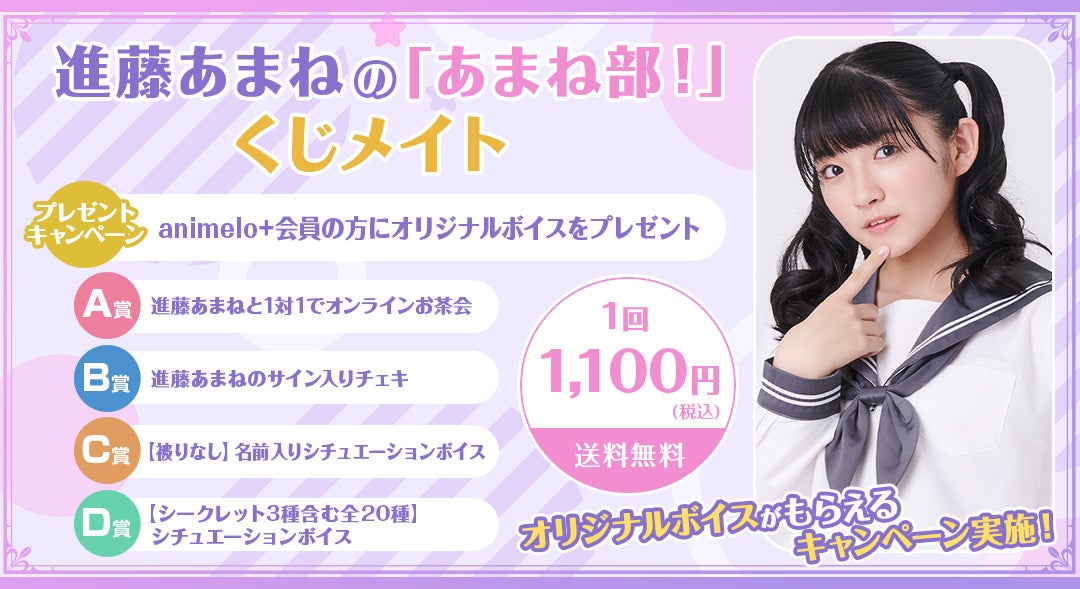 アニメイトのオンラインくじサービス「くじメイト」において、声優 進藤あまねのニコニコチャンネル「あまね部!」とコラボした、『進藤あまねの「あまね部!」くじメイト』が販売開始。
