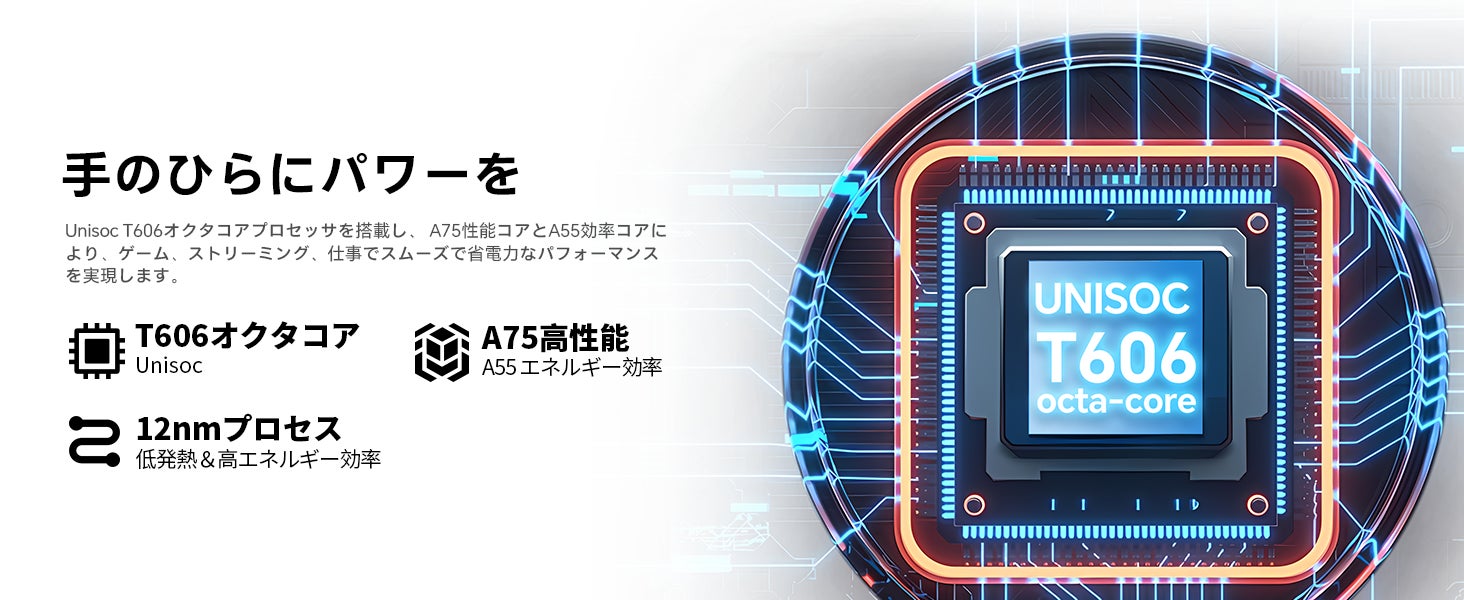 Unisoc T606オクタコアプロセッサを搭載し、 A75性能コアとA55効率コアにより、ゲーム、ストリーミング、仕事でスムーズで省電力なパフォーマンスを実現します。