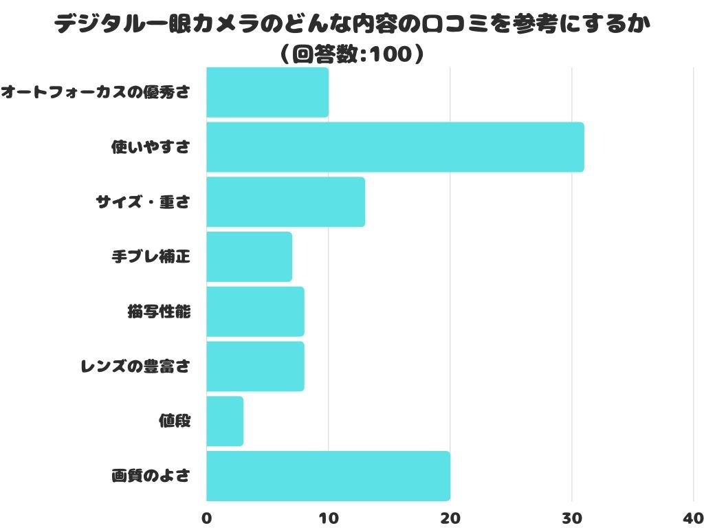 デジタル一眼カメラのどんな内容の口コミを参考にするかをアンケートにて調査したところ、1位は「使いやすさ」でした。