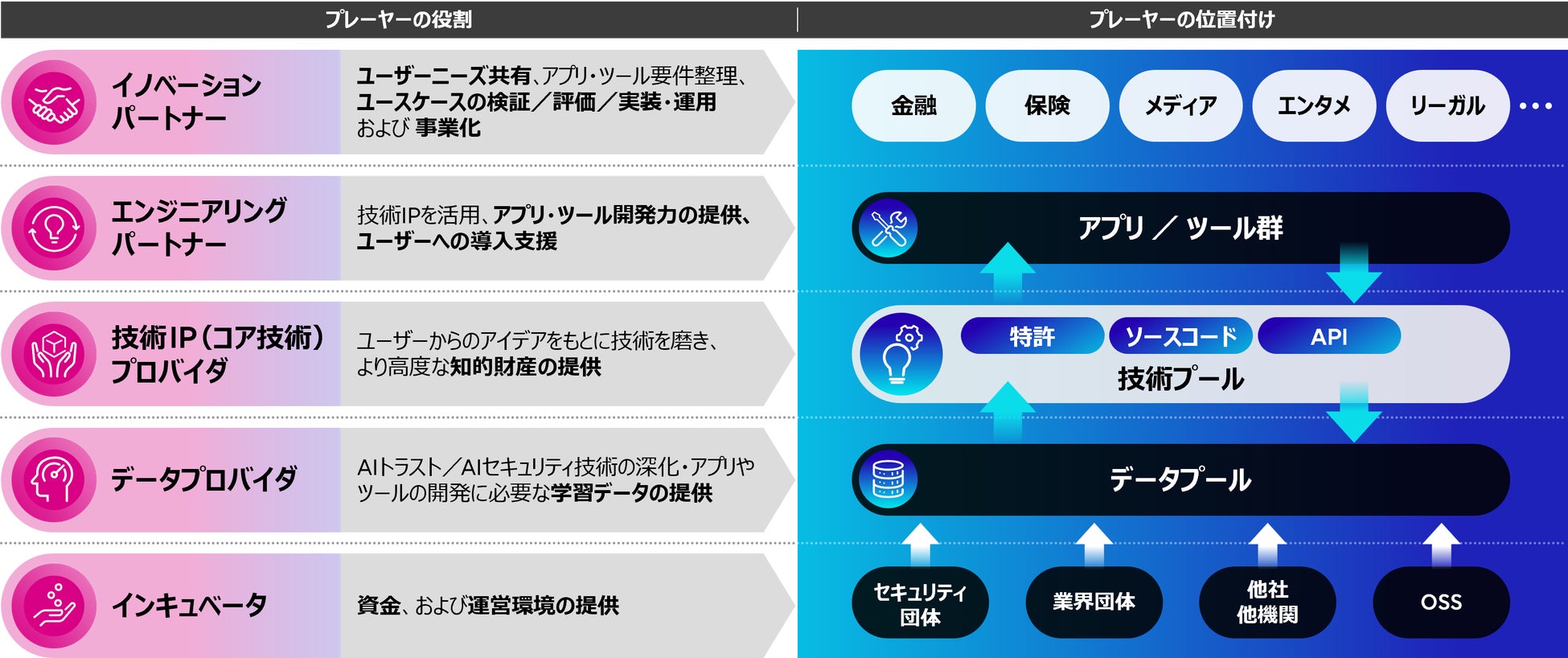 本コンソーシアムでは、各業界の課題やユーザーニーズ、ユースケースを提供するイノベーションパートナー、ユーザーからのアイデアをもとに技術を磨く技術IP(コア技術)プロバイダ、学習データを提供するデータプロバイダ、アプリケーション開発やユーザーへの導入支援を行うエンジニアリングパートナー、資金および運営環境を提供するインキュベータが集い、新たなアイデアを創出できる技術プールを軸としたグローバルコミュニティを構築・提供します。