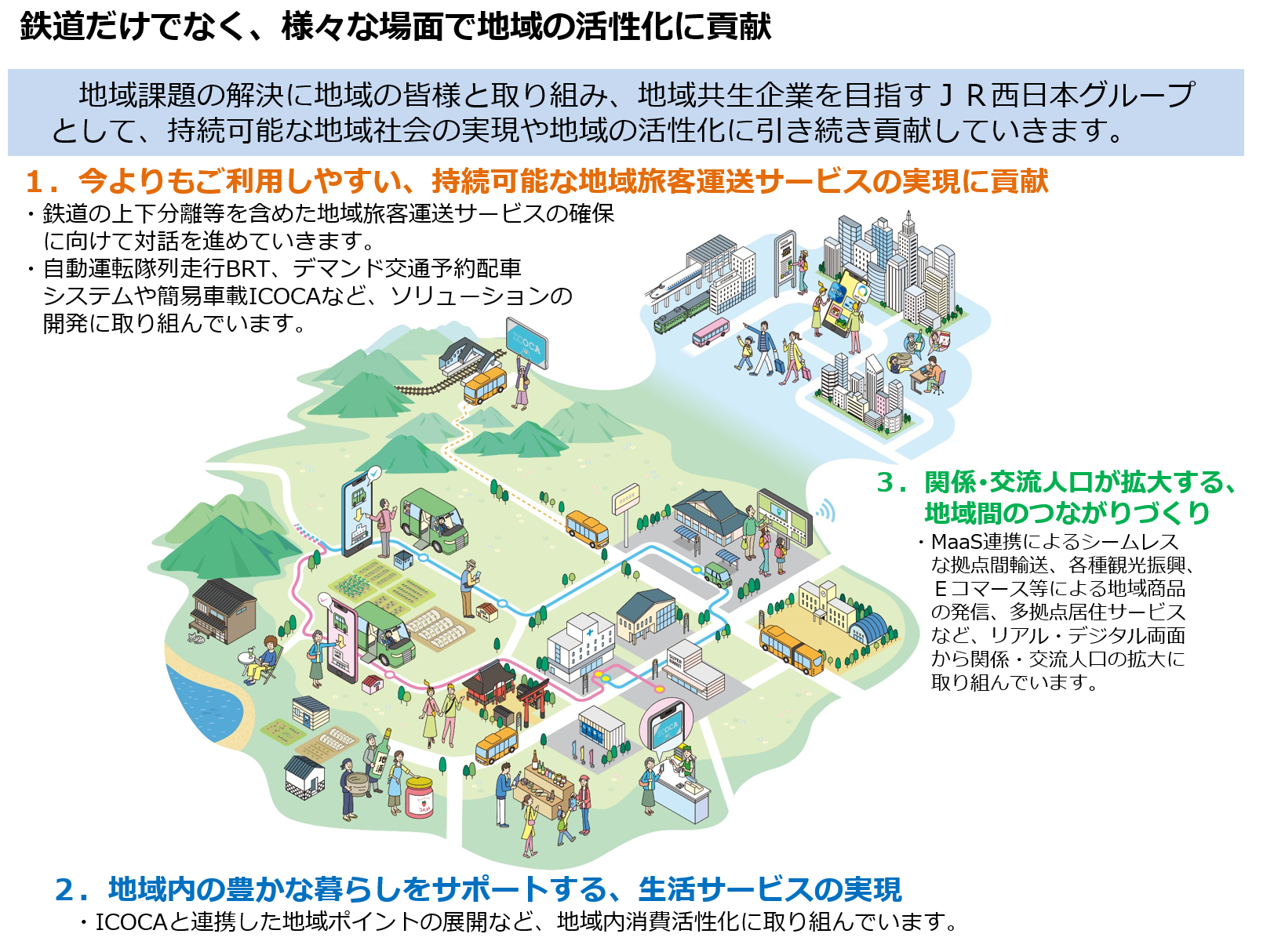 JR西日本グループは、地域公共交通の課題解決に地域の皆様と取り組み、今よりもご利用しやすい持続可能な地域旅客運送サービスの実現や地域の活性化に貢献する地域共生企業を目指しております。