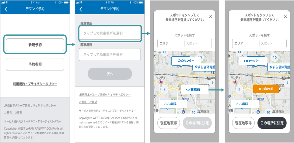 ・予約操作について、乗降場所は地図上に現れる場所名をタップするだけで、どなたでも簡単に選択することができます。
