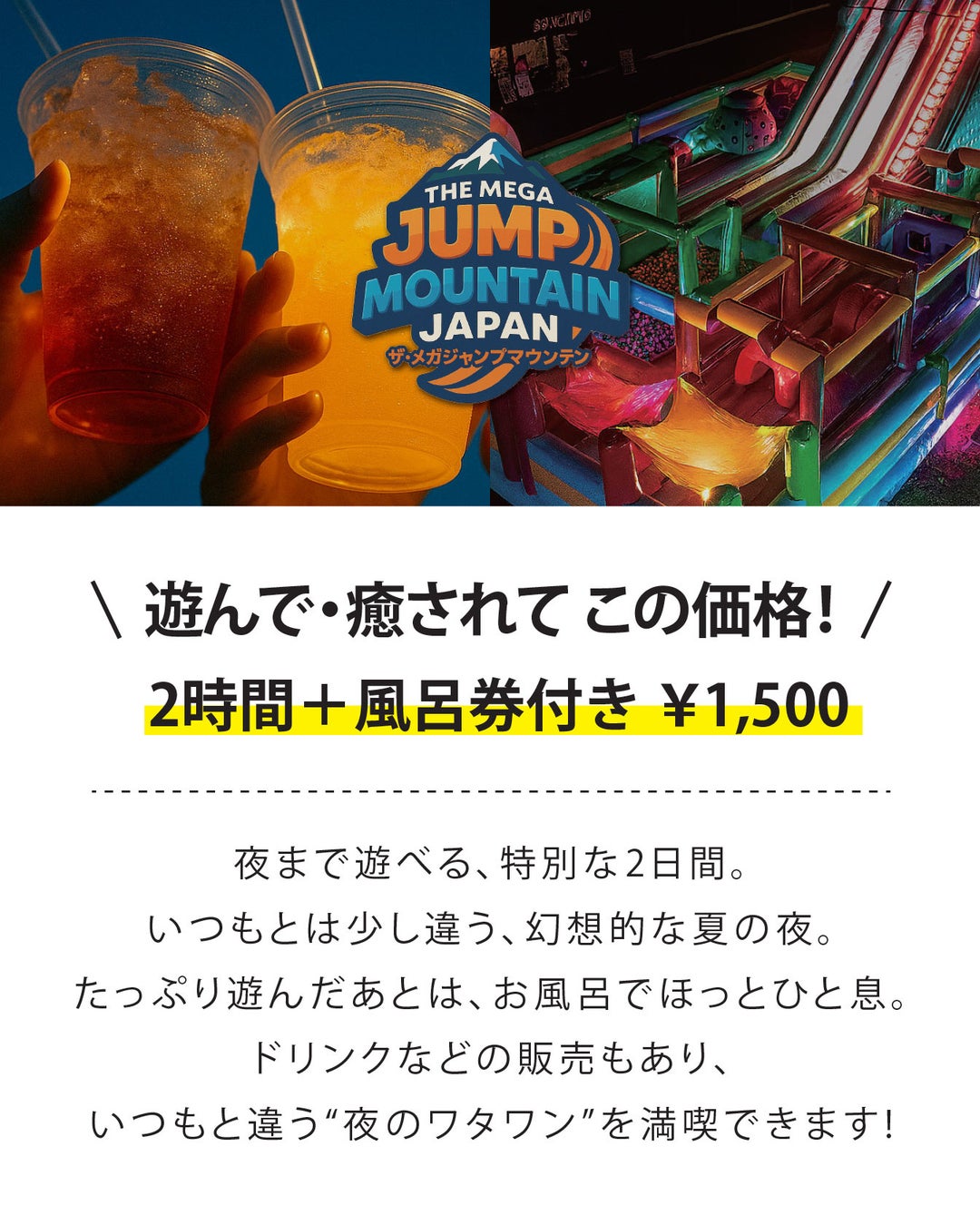 光と音に包まれる夜限定特別プランが2日間限定で登場!巨大ふわふわ遊具《THE MEGA JUMP MOUNTAIN JAPAN》で遊んだ後は、SOKOTOTOの温浴で“ととのう”贅沢なひととき