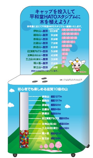 来場者への環境配慮に関する意識啓発のため、ペットボトル回収ブースを設置し、使用済みペットボトルの適切な回収と資源の有効活用を促進します。また、回収したペットボトルキャップの数量に応じて平和堂HATOスタジアムに苗木を寄贈し、ご来場の皆様自身のアクションが環境保全につながっていることを見える化します。