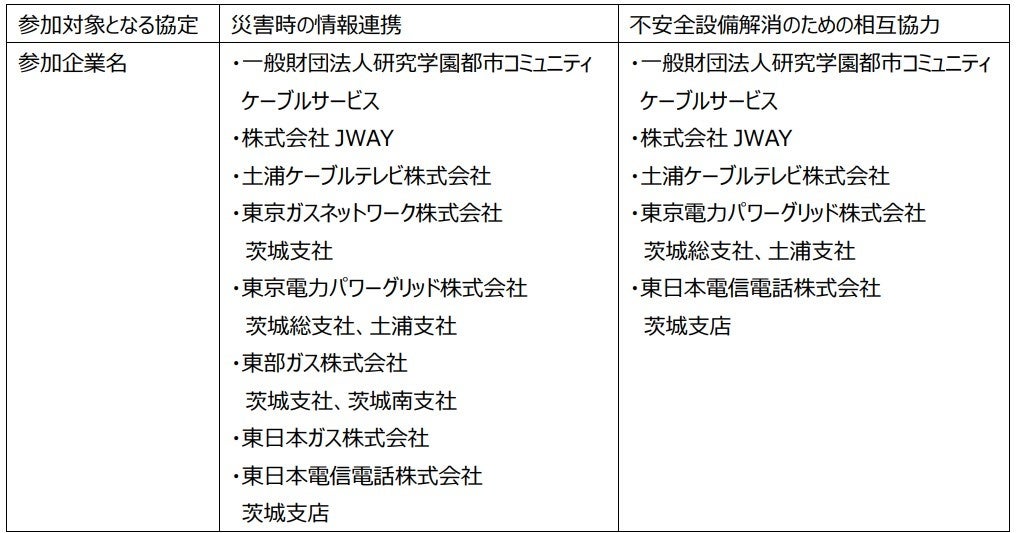茨城県内のインフラマネジメント機能を有する民間事業者8社※1 は、インフラ事業の効率化および地域課題解決の取り組みに関する連携協定書に基づき、災害発生時における被災状況の早期把握及び被災設備の早期復旧のための情報連携(8社※1)、及び、各社が所有する設備に不安全状態発生時における、不安全状態の早期解消に向けた相互協力(5社※1)について協定を結ぶことになりましたので、締結式を開催します。