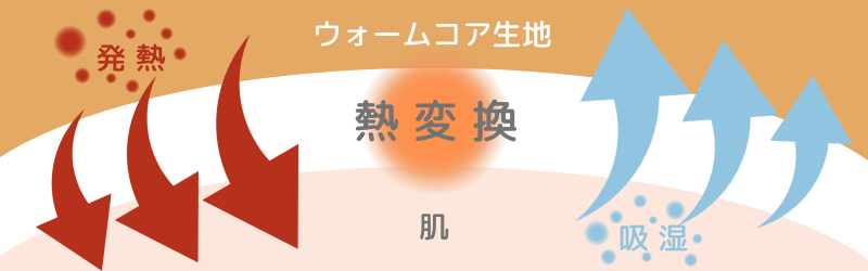 人の体からは常に水分が蒸発しています。ニッセンオリジナルのあったかブランドである『WARMCORE(ウォームコア)』は、汗や湿気を吸収して、熱エネルギーに変えて発熱するあったか素材です。