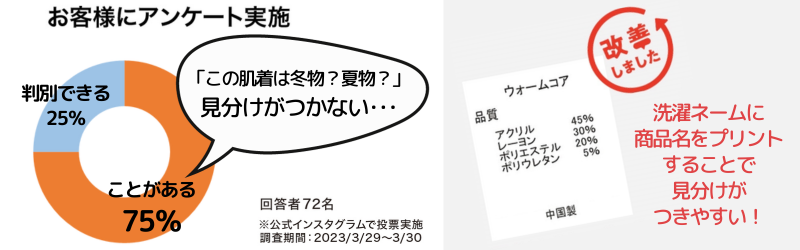 機能性肌着は同じような見た目なので、「夏物」と「冬物」を見間違えてしまう。判別しづらい。というお客様の声を参考に、SNSでアンケートを実施。その結果、「判別できないことがある」が75%と非常に多い結果になりました。