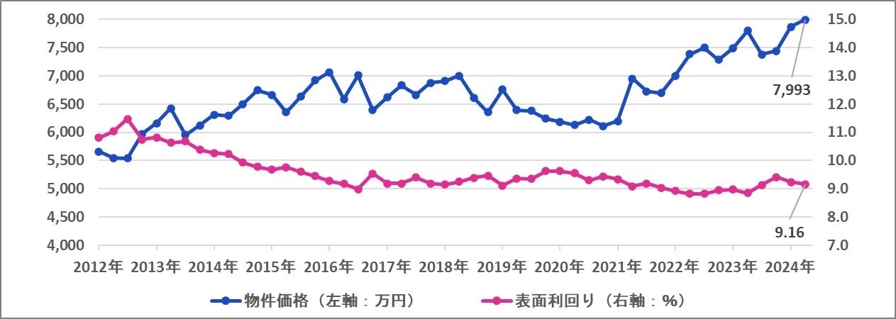 しかし今回のレポートでは、これまで通り価格高騰の傾向は変わらず、前四半期に続いて全ての物件種別で価格が上昇する結果となりました。区分マンションと一棟アパートは過去最高値を連続更新しています。特に区分マンションについては、2023年7-9月期から4四半期連続で過去最高値を記録しており、2012年の集計開始以降初めて2200万円台に乗りました。