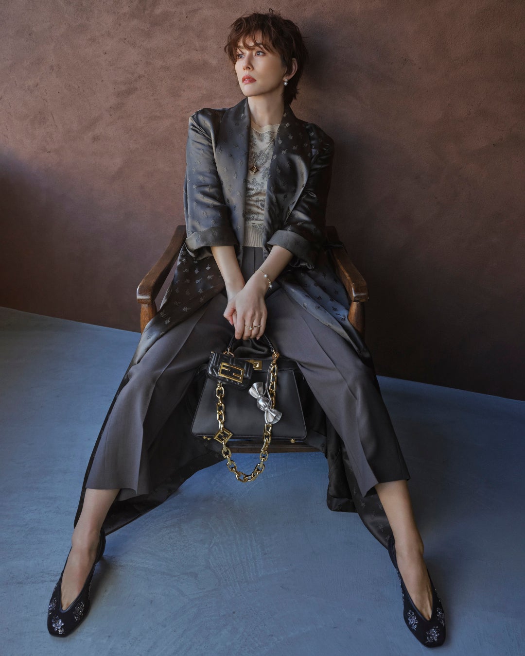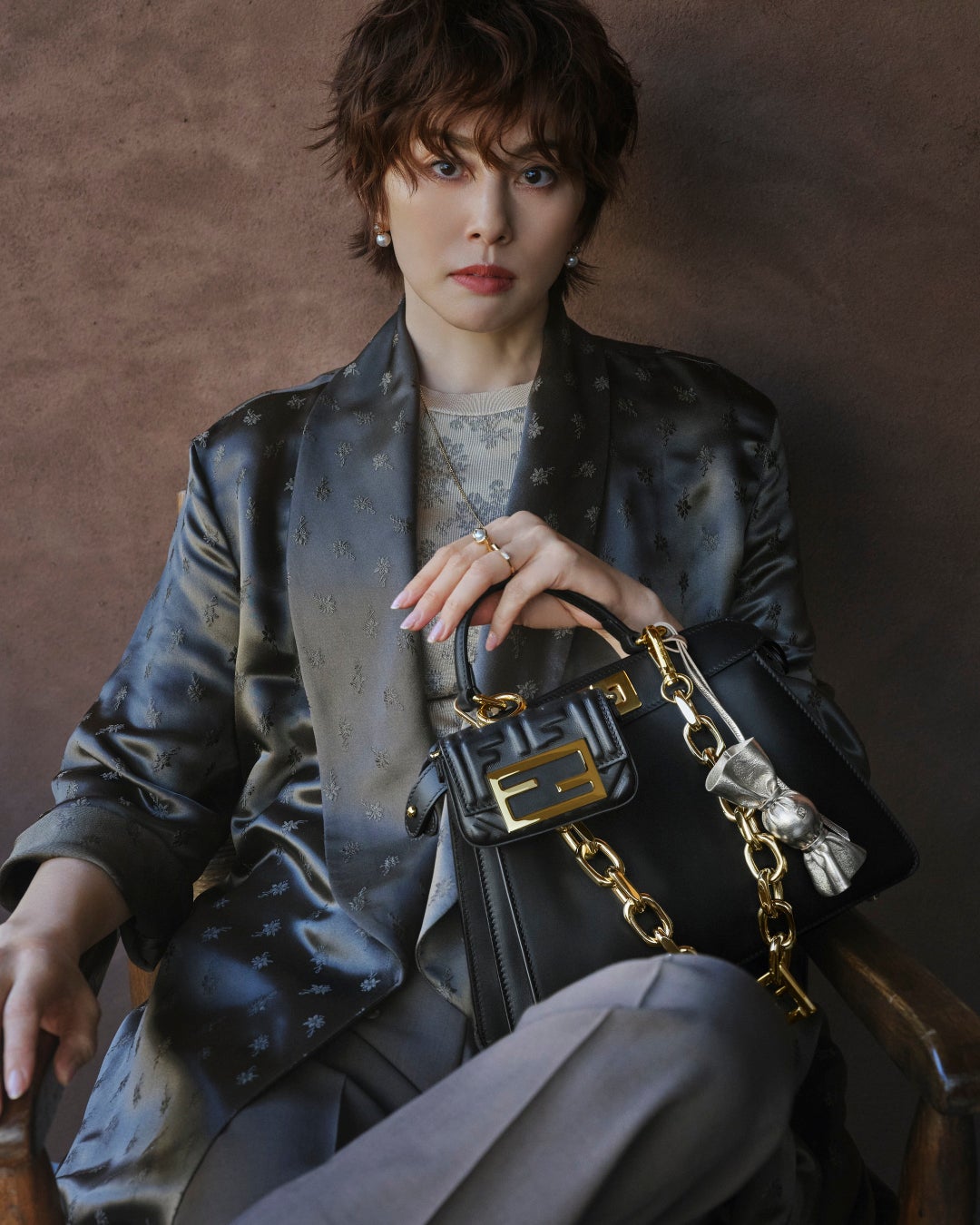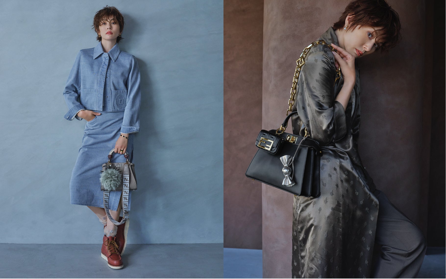 本編では、米倉涼子さんが「ピーカブー」に合わせた2つのスタイルを披露しています。1つ目は、デニムのセットアップに、アメリカのフットウェアブランド、「レッドウィング(Red Wing)」との共同制作による「フェンディ アンド レッドウィング(FENDI and RED WING)」ブーツを合わせたコーディネート。ダヴカラーの「ピーカブー ミニ(Peekaboo Mini)」に「ピーカブー」専用のハンドルと「FF」ロゴモチーフが施された「ストラップ ユー(Strap You)」、パイナップル型のチャームを取り付け、エレガントで軽やかなスタイルを完成させました。2つ目は、春らしいピンクカラーのジャガードニットにブラウンのテーラードパンツを合わせ、フローラルブーケの モチーフが施されたロングコートを羽織ったコーディネート。ブラックのアイコニックな「ピーカブー アイシーユー スモール(Peekaboo ISeeU Small)」に「ナノ バゲット(Nano Baguette)」、「フェンディ ソースイート チャーム(FENDI So Sweet Charm)」、「FF ダイアモンド(FF DIAMOND)」モチーフがあしらわれた「ストラップ ユー」を取り付け、遊び心のある大人なスタイルを披露しました。