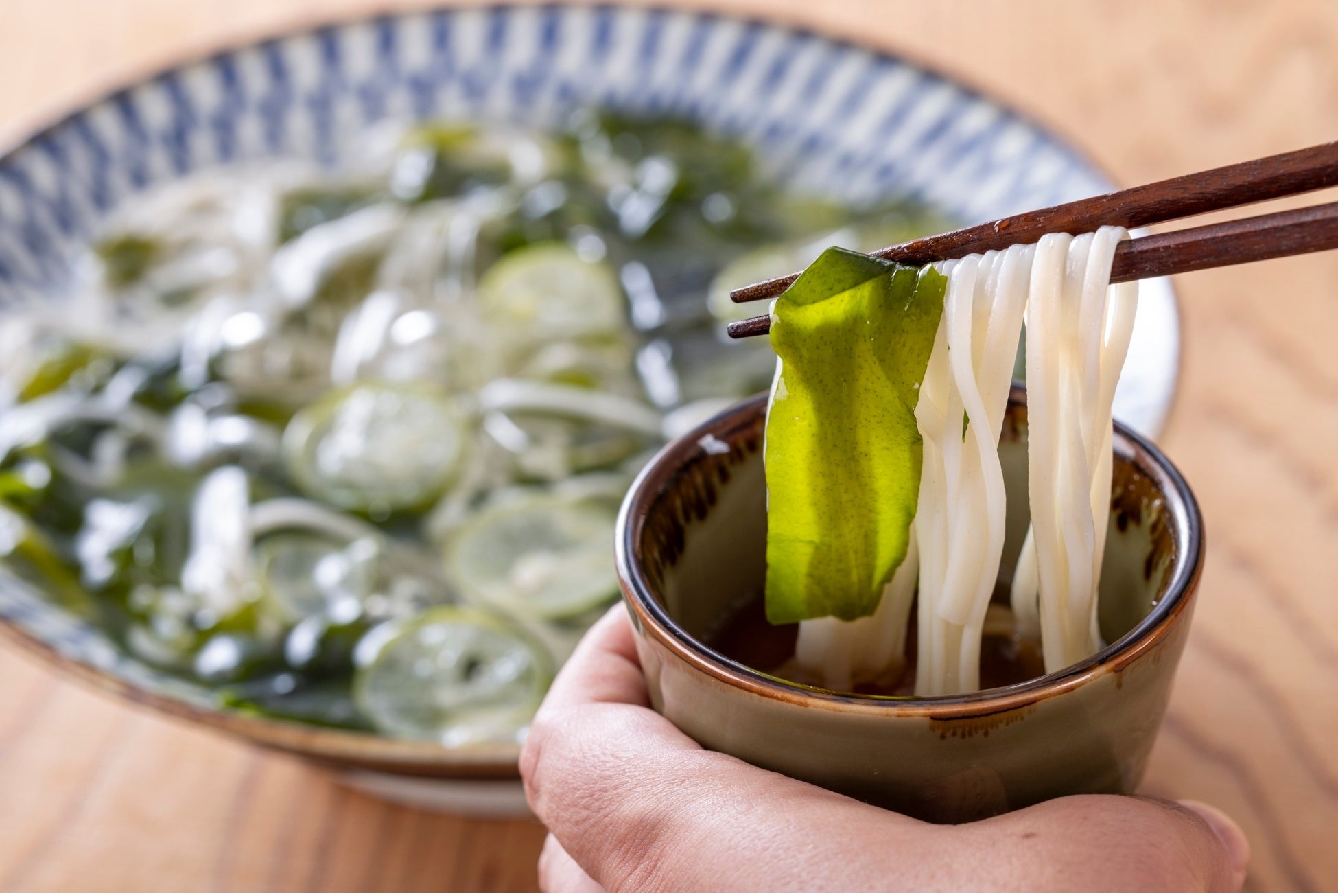 鳴門の渦潮を生み出す激しい激流で育ったシコシコとした歯ごたえと風味の良さが特長の鳴門わかめと舌触りとのど越しの良さが絶品の半田そうめんを自家製の飲めるポン酢でつるっとお楽しみください。