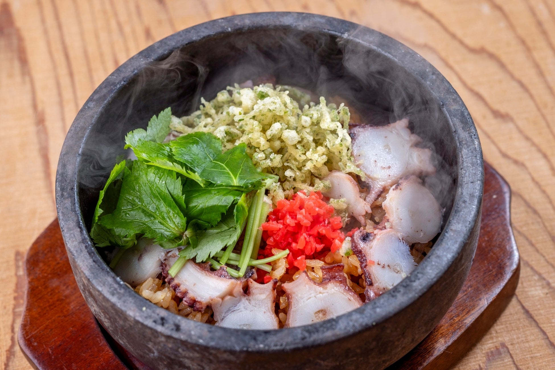 真だこづくしの贅沢なごはんは、石焼の香ばしい香りに揚げ玉の食感、薬味の三つ葉と紅しょうがの風味が相まって食事にも〆にも満足の一品です。