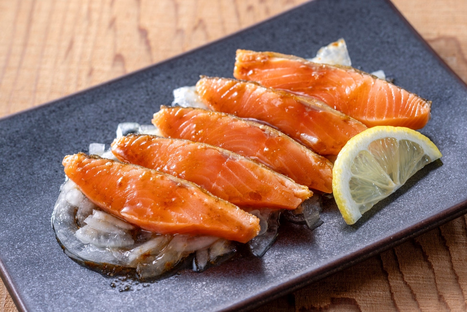 成長段階にあわせて淡水養殖から海面養殖に切り替え、養殖独特の臭みがでないよう餌の成分や育成環境を整えて大切に育てられたサツキマスは美しい朱色としっとりとした脂の甘みが魅力です。