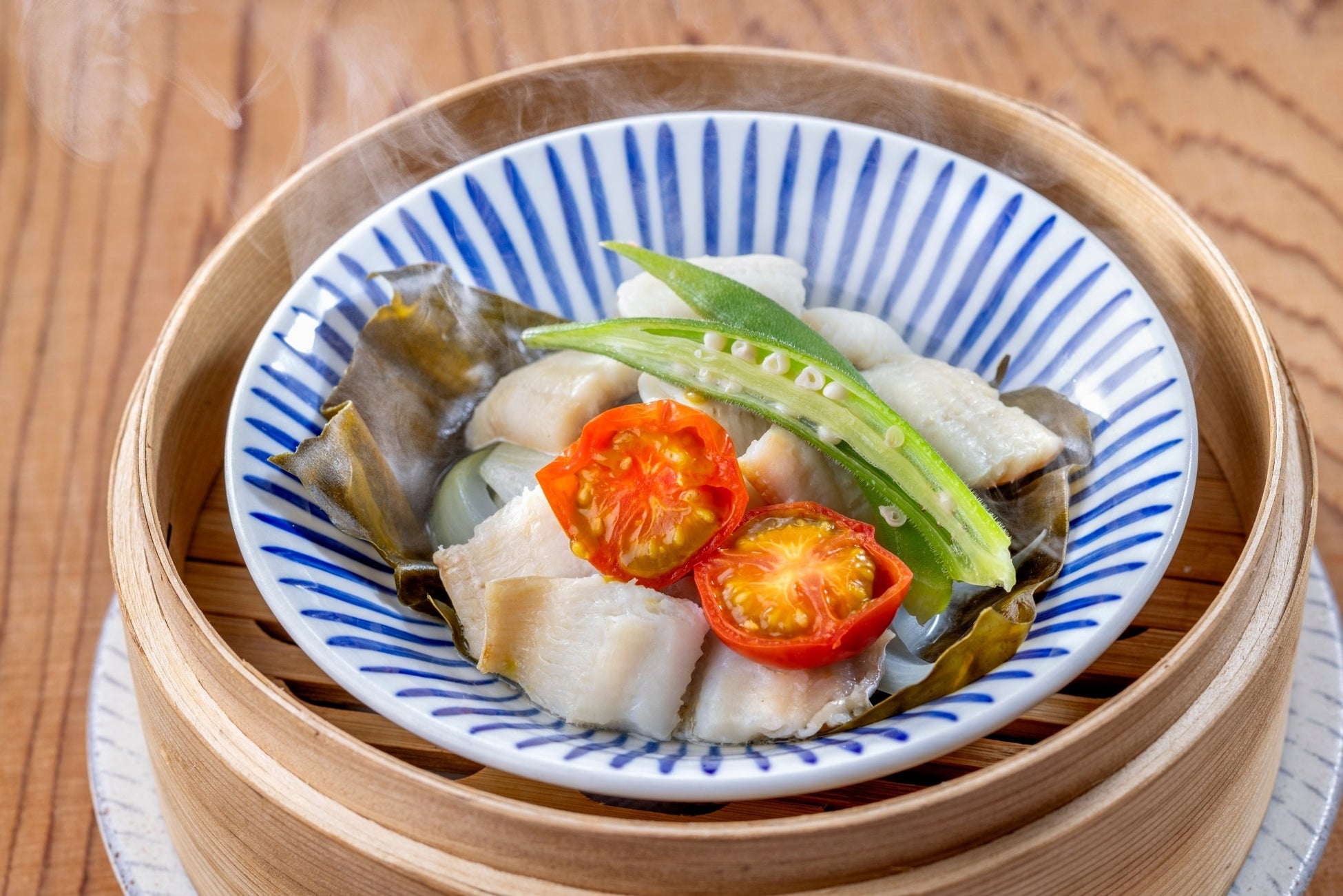 今回、山口県産のハモを昆布締めにして旨味を凝縮し、淡路玉葱と一緒に蒸籠蒸しに仕上げました。ハモ独特のふわっとした舌触りと香りを特製のすだちポン酢をつけてお楽しみください。