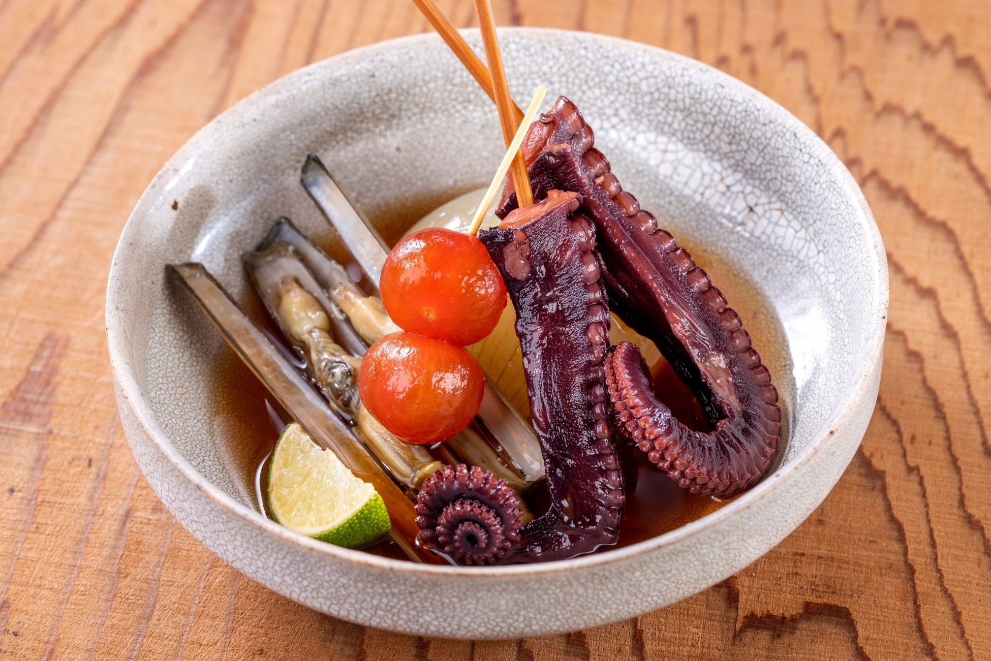 柔らかく香りのよい瀬戸内の真だこのなかでも特に肉厚な香川県産の真だこと山口県周防大島から届くマテ貝を冷やしおでんにしました。