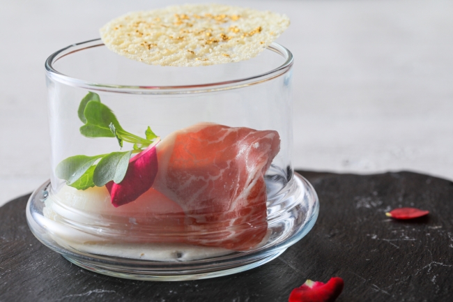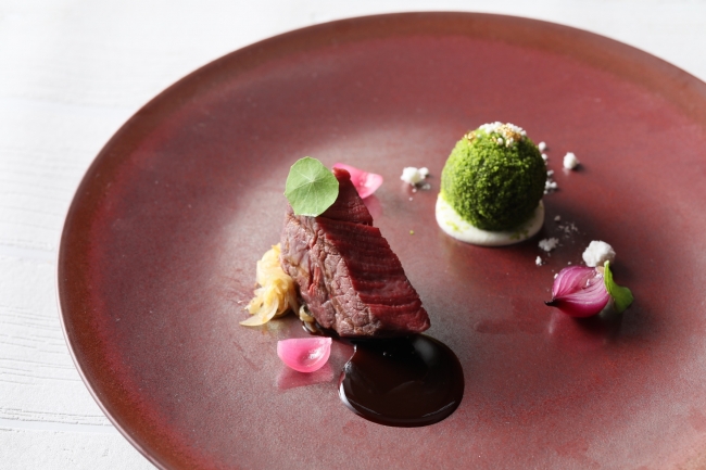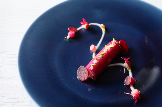 ズワイ蟹と赤紫蘇のインボルティーニ ビーツのアクセント