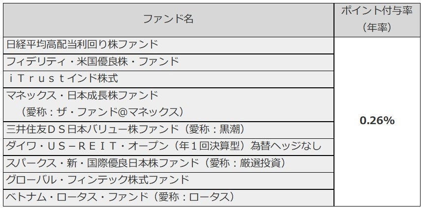 積立設定が可能で、お客様から人気の高い投資対象・投資テーマをカバーするバラエティに富んだ9本を選定し、2024年10月保有分より下記9銘柄の投信保有ポイント付与率を、通常0.08%(年率)から、0.26%(年率)に引き上げます。対象銘柄はお客様のニーズなどを鑑み、定期的に見直しを行っていく予定です。