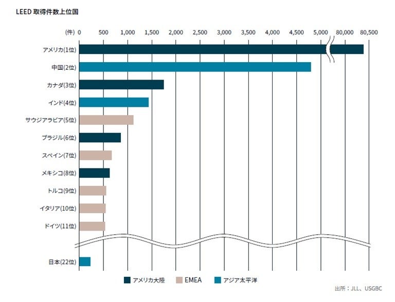 気候変動など環境危機が迫るなか、建築物などの環境性能の向上は不可欠であり、今後、日本でも世界で最も普及する認証制度であるLEED認証の取得が進むものと期待されます。LEED認証は、2022年12月末時点で世界150カ国・地域で10万件を超える取得件数があり、日本は223件、世界第22位です。