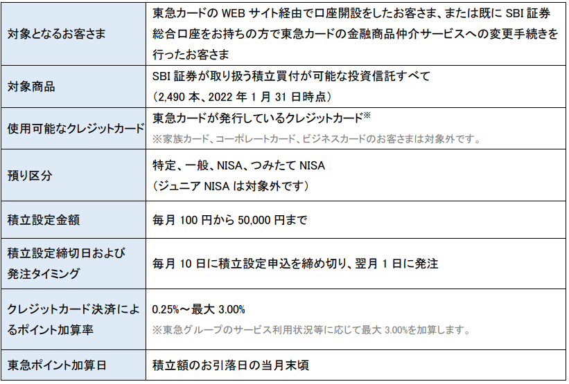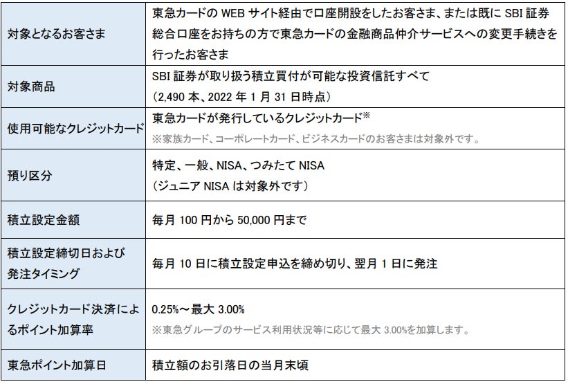 株式会社SBI証券(本社:東京都港区、代表取締役社長:髙村正人、以下「当社」)と東急カード株式会社(代表取締役社長:梅原昌弘、以下「東急カード」)は、金融事業における業務提携契約を締結し、2022年4月を目途として金融商品仲介サービスを開始し、東急カードが発行するクレジットカードで投資信託が買える投信積立サービス「クレカつみたて」や、資産運用に応じて、東急ポイントを加算するサービスの提供を開始します。