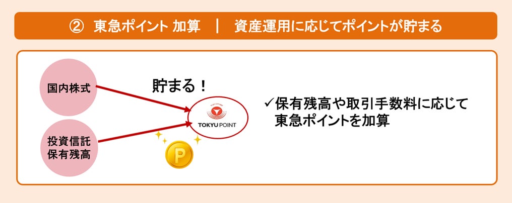 「クレカつみたて」に応じて加算されるポイントとは別に、当社のWEBサイト上で東急ポイント連携の設定を行うと、投資信託の保有残高や資産運用に応じた東急ポイントが加算されます。