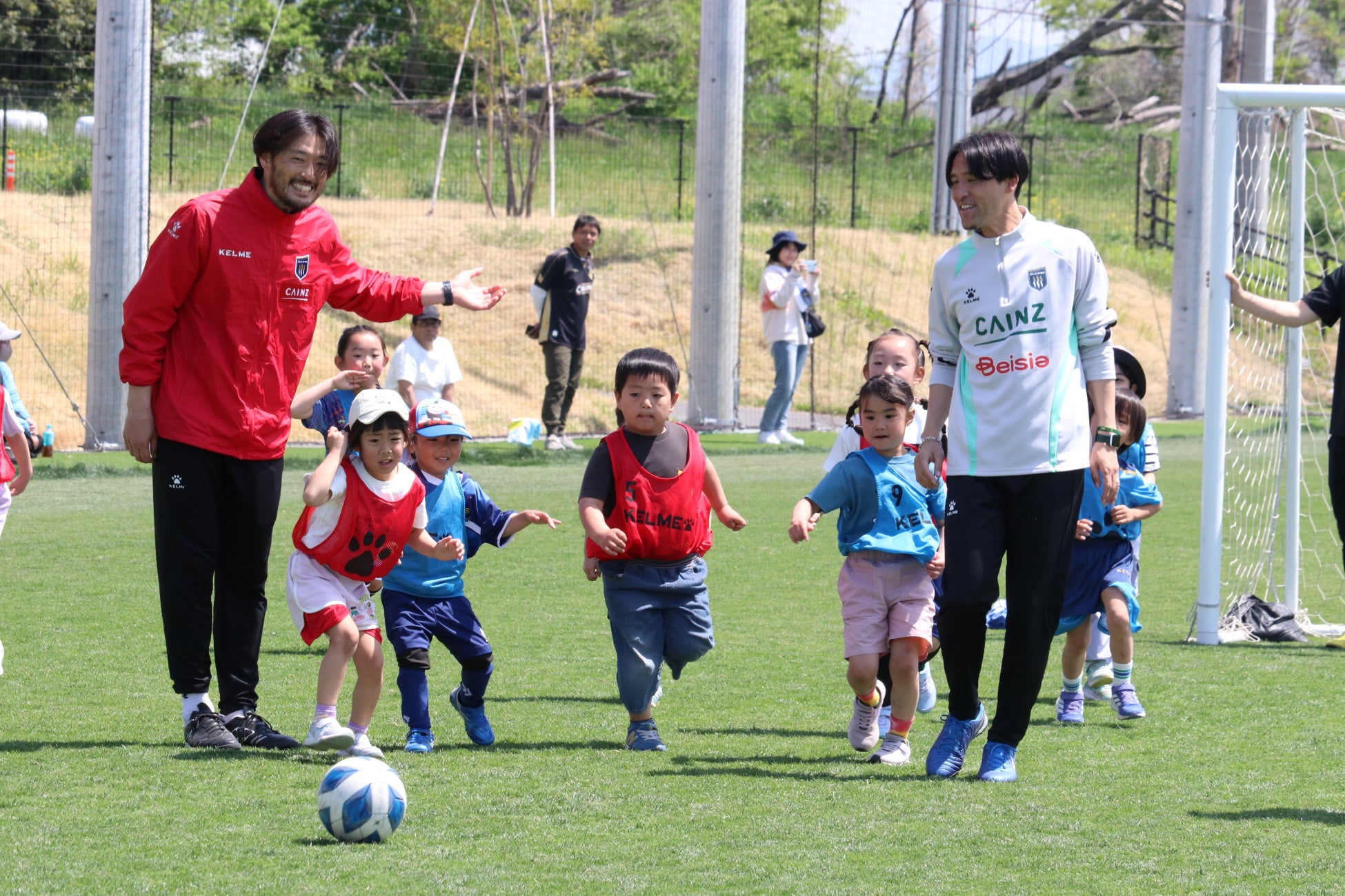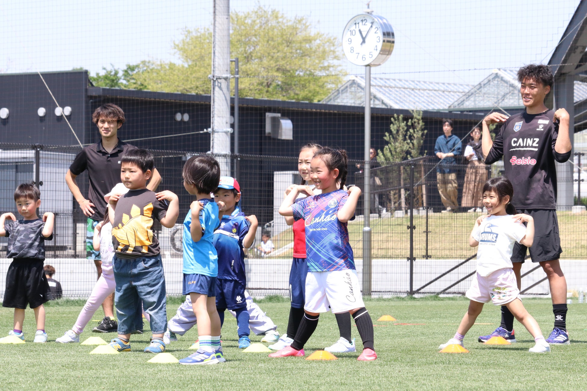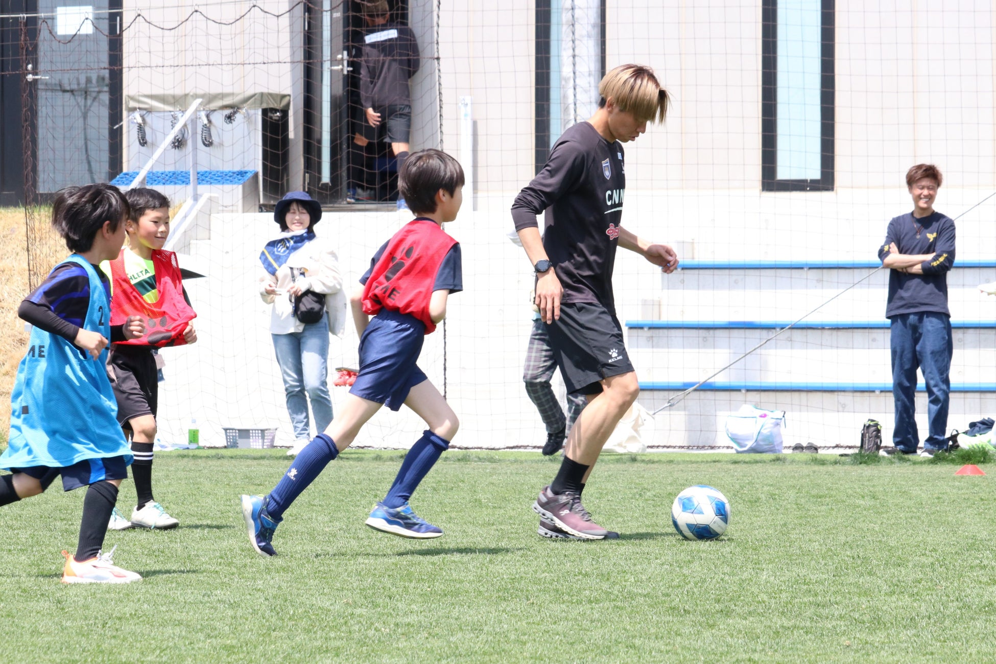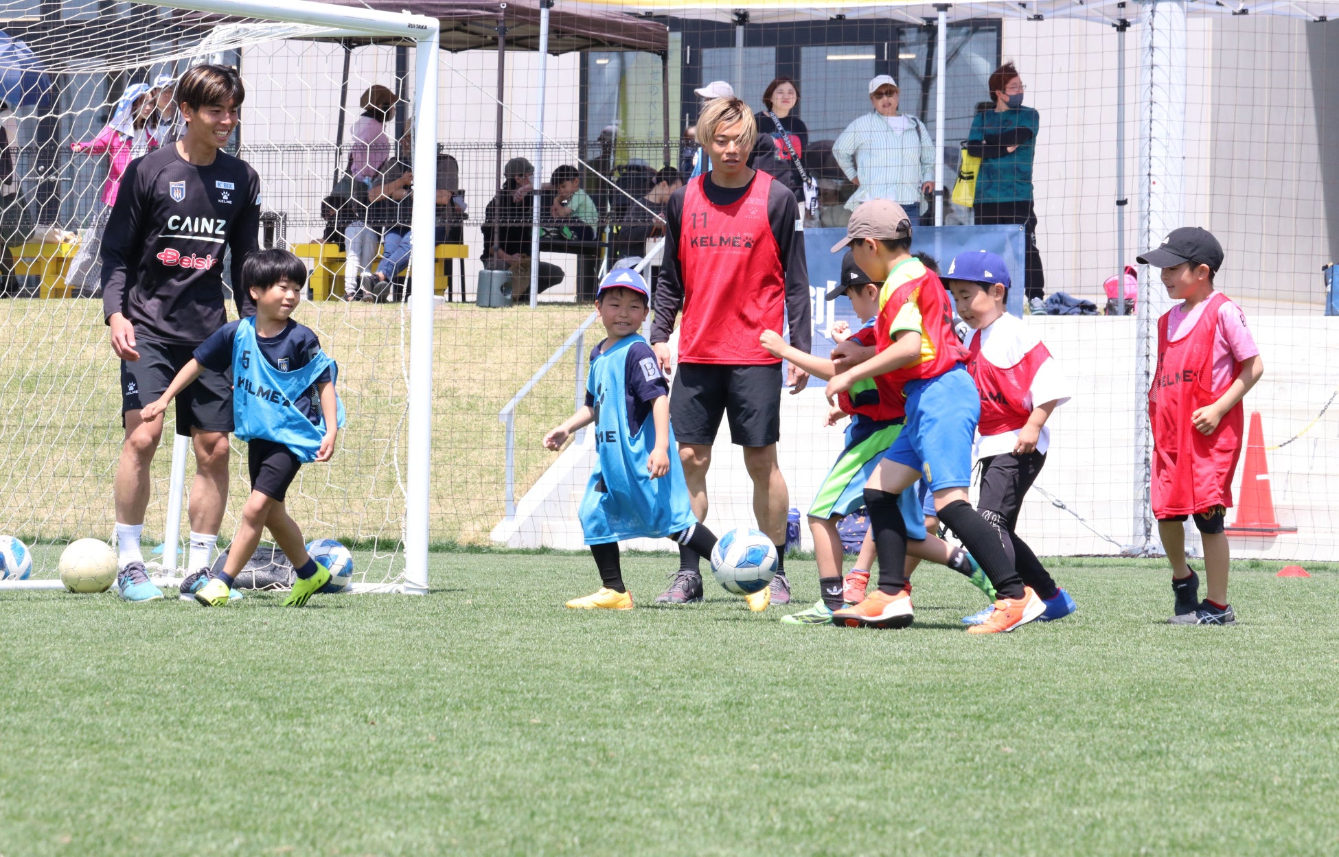 「ふれ合いミニサッカー」では、子どもたちが2チームに分かれ紅白戦を実施。選手や細貝さん、清水さんもチームに交じり、「そっちにボールが行ったよ」とアドバイスしたり、「ナイスシュート」と声掛けしたりするなど、笑顔と歓声に満ちた戦いが繰り広げられました。
