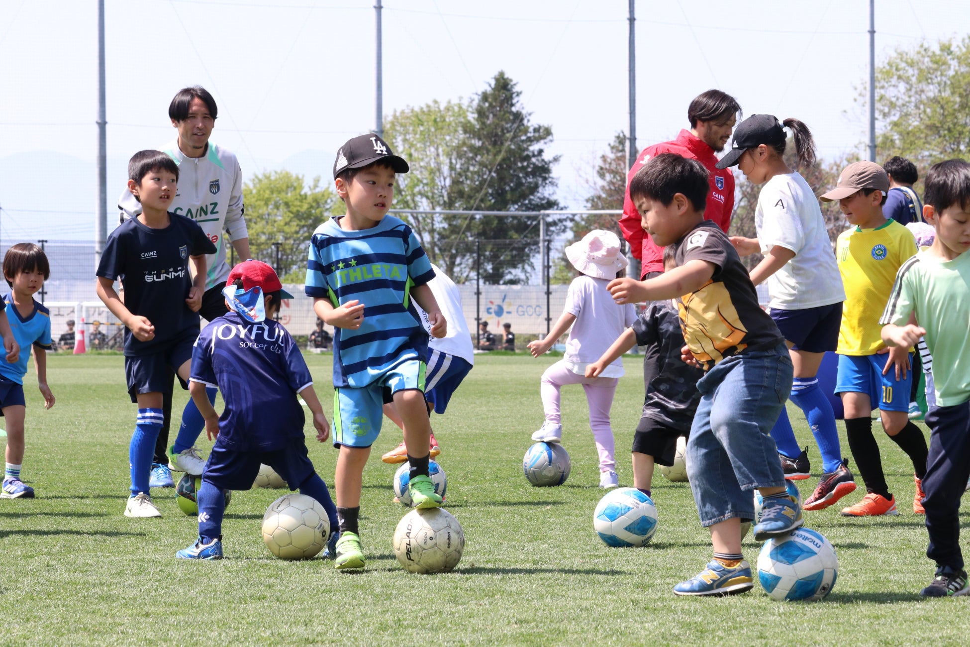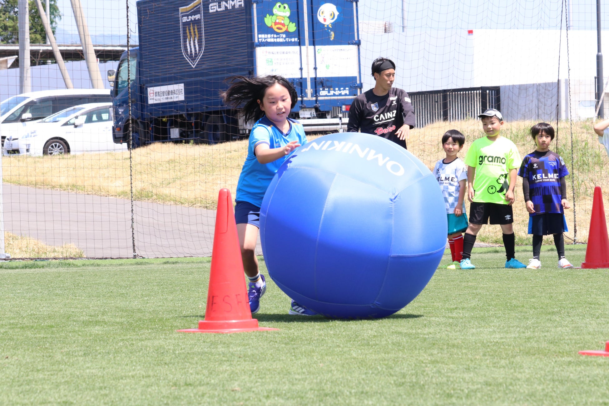 本イベントは、子どもの運動機会の提供、体力向上、健康増進を目的に、ザスパのクラブハウスであるGCCザスパーク(以下、「ザスパーク」)のグラウンドを利用して実施したもので、未就学児から小学校4年生までの子ども41名が参加しました。サッカーになじみが少ない子どもたちも多く参加し、青空の下、ザスパ群馬トップチームの選手も加わって、「ふれ合いミニサッカー」、「走り方トレーニング」、バランスボールやキンボールを使った芝生あそび「芝生でおもいっきり楽しもう」などを行い、風を感じながら汗を流しました。