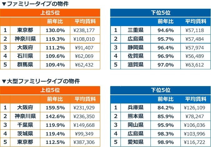 東京都の平均賃料は、シングルタイプで前年比114.0%(上昇率全国2位)、カップルタイプで125.1%(全国1位)、ファミリータイプで130.0%(全国1位)、大型ファミリータイプで112.5%(全国5位)と、全ての物件タイプで上昇しました(※1)。全ての物件タイプで平均賃料が上昇したのは東京都のみです(※2)。