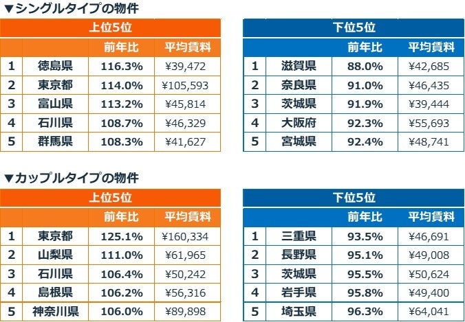 シングルタイプの賃料上昇率では、2位の東京都(114.0%)を抑えて徳島県(116.3%)が1位でした。富山県(113.2%)が3位、石川県(108.7%)が4位と、北陸エリアの2県も高い上昇率を見せています。
