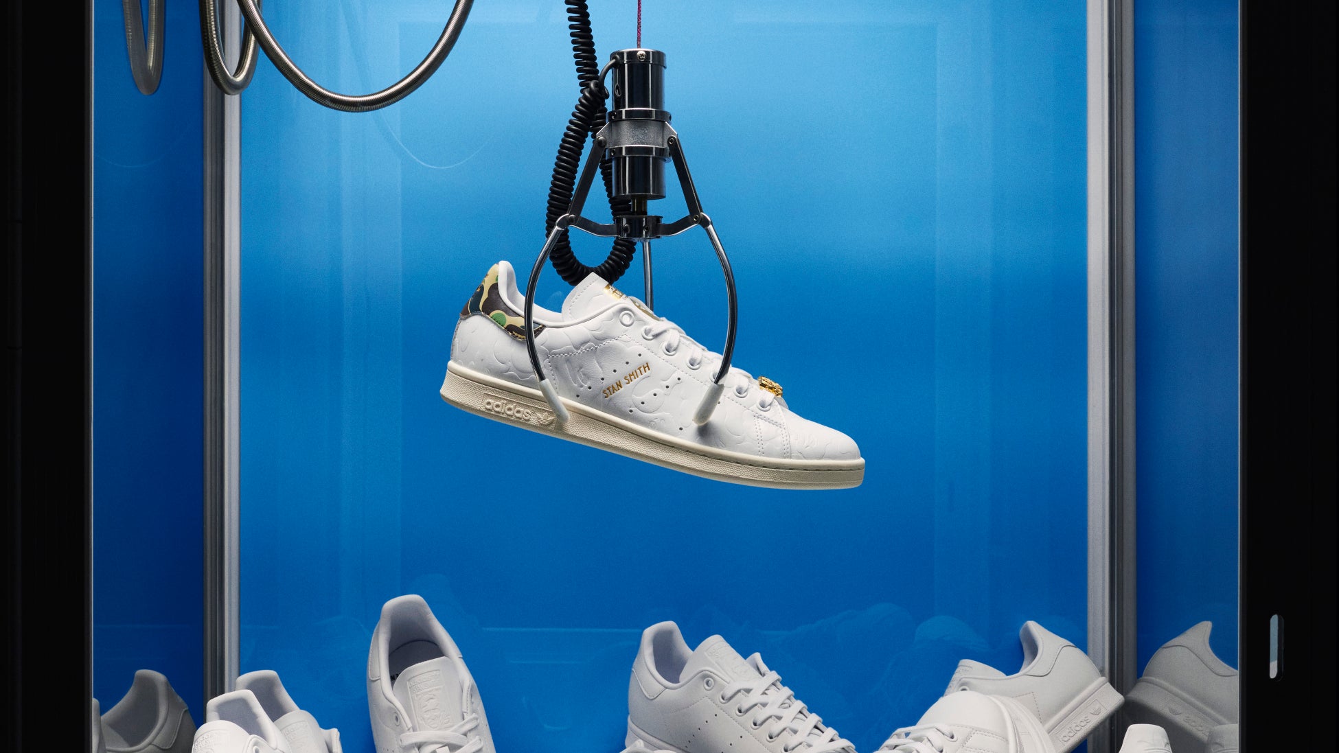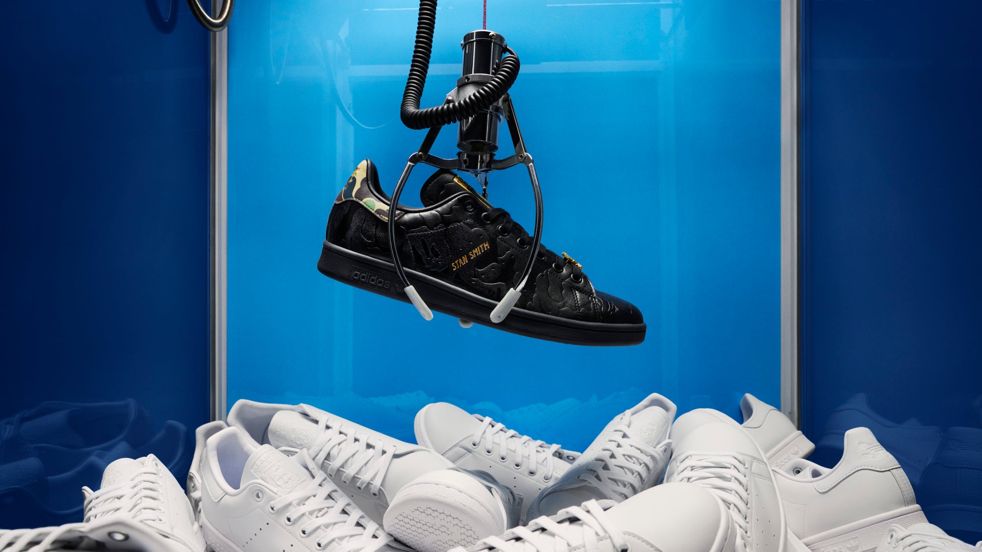 STAN SMITH BAPE® をクレーンゲーム機の中に並べて、その魅力を遊び心いっぱいに引き出しています。