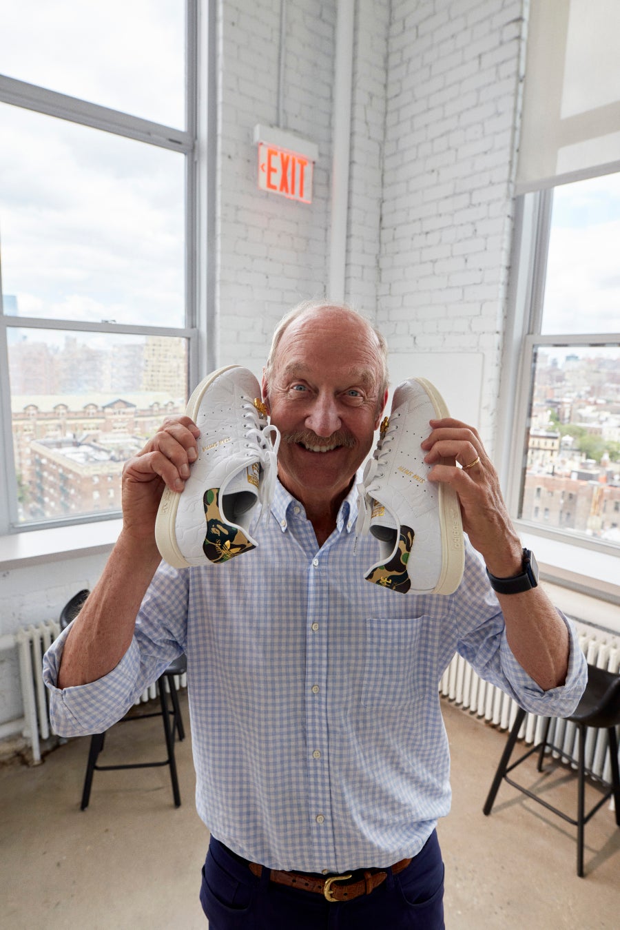 シュータンのスタン・スミス氏の肖像は、右のみをエイプヘッドを金箔であしらい、このコラボレートを象徴しています。