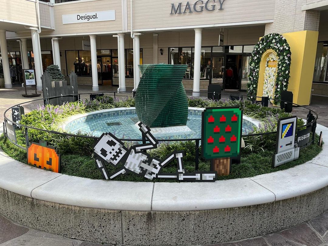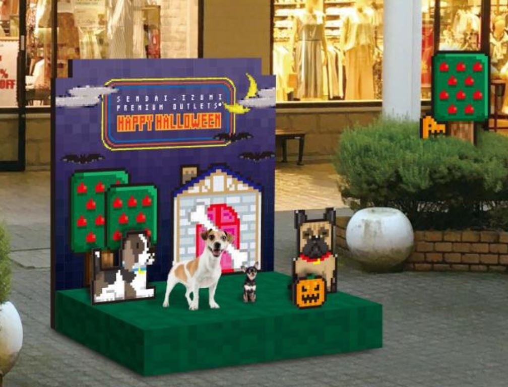 レトロなピクセルアートで描かれたカボチャやコウモリ、ガイコツなどのキャラクターが施設内のあちこちに登場し、ハロウィーンシーズンのアウトレットを賑やかに演出しています。愛犬専用のフォトスポットも設置しています。