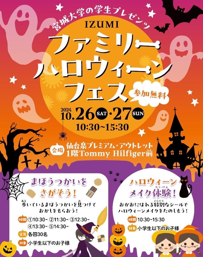 仙台泉プレミアム・アウトレット(所在地:宮城県仙台市 運営:三菱地所・サイモン株式会社、以下「三菱地所・サイモン」)と宮城大学(本部所在地:宮城県黒川郡大和町)は、産学連携による企画の第二弾として、大学生が考案し運営する、子どもたちが楽しめるハロウィーンイベント「IZUMI ファミリーハロウィーンフェス」を2024年10月26日(土)、27日(日)に開催します。