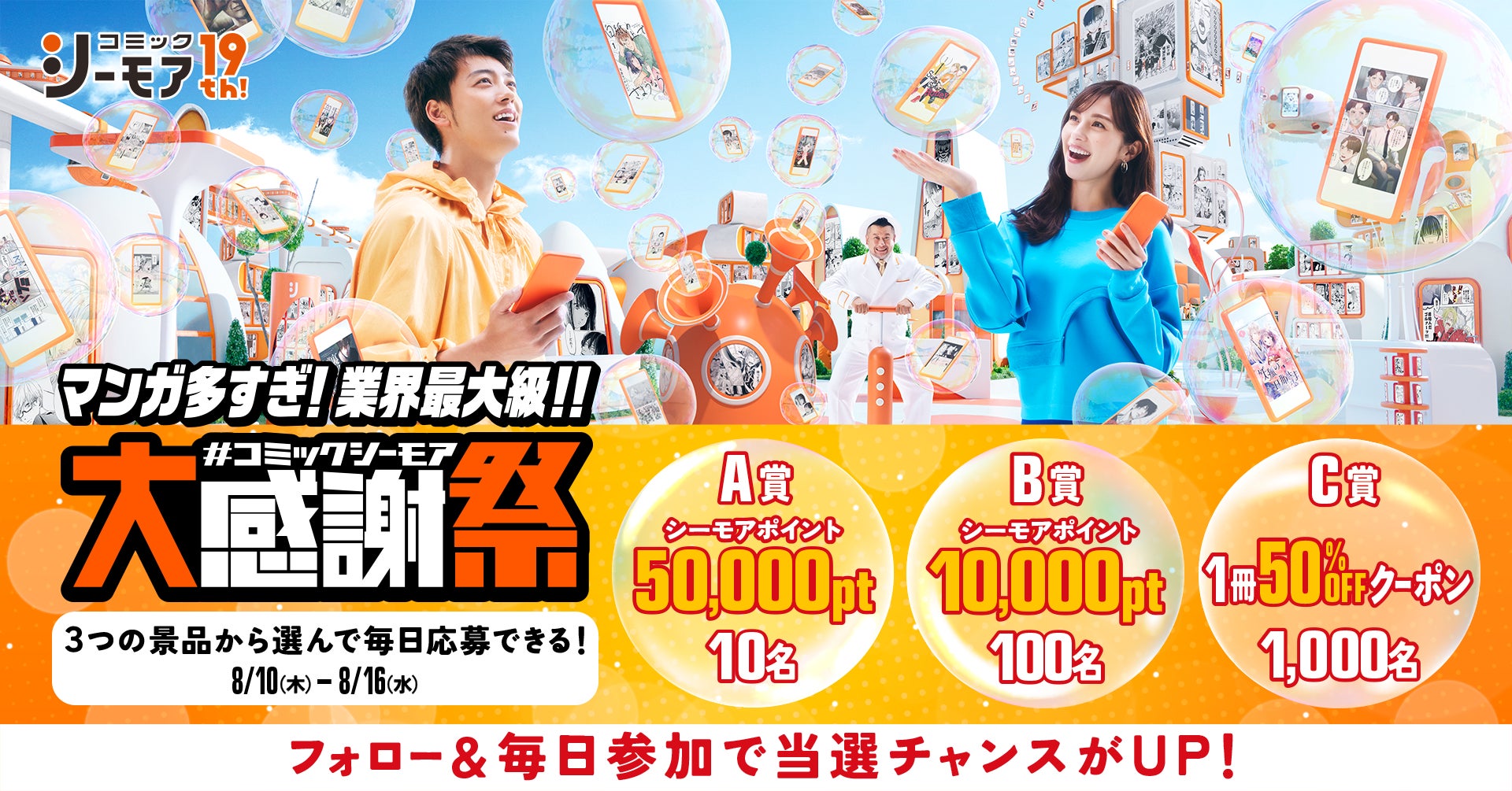 8月16日は電子コミックの日コミックシーモア19周年キャンペーンを開催!最大シーモアポイント50,000ポイントや50%OFFクーポンが当たるチャンス!