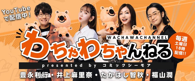 毎週土曜日 18:00配信!マンガ愛溢れる「コミックシーモア」のYouTube番組、その名も「わちゃわちゃんねる」!人気声優陣、福山潤・たかはし智秋・豊永利行・井上麻里奈のMC陣とわちゃわちゃと楽しいトークを交え、ソルマーレ編集部作品を中心に電子コミックの楽しさ、面白さを様々な角度から深掘りし皆様にお届けする番組です。