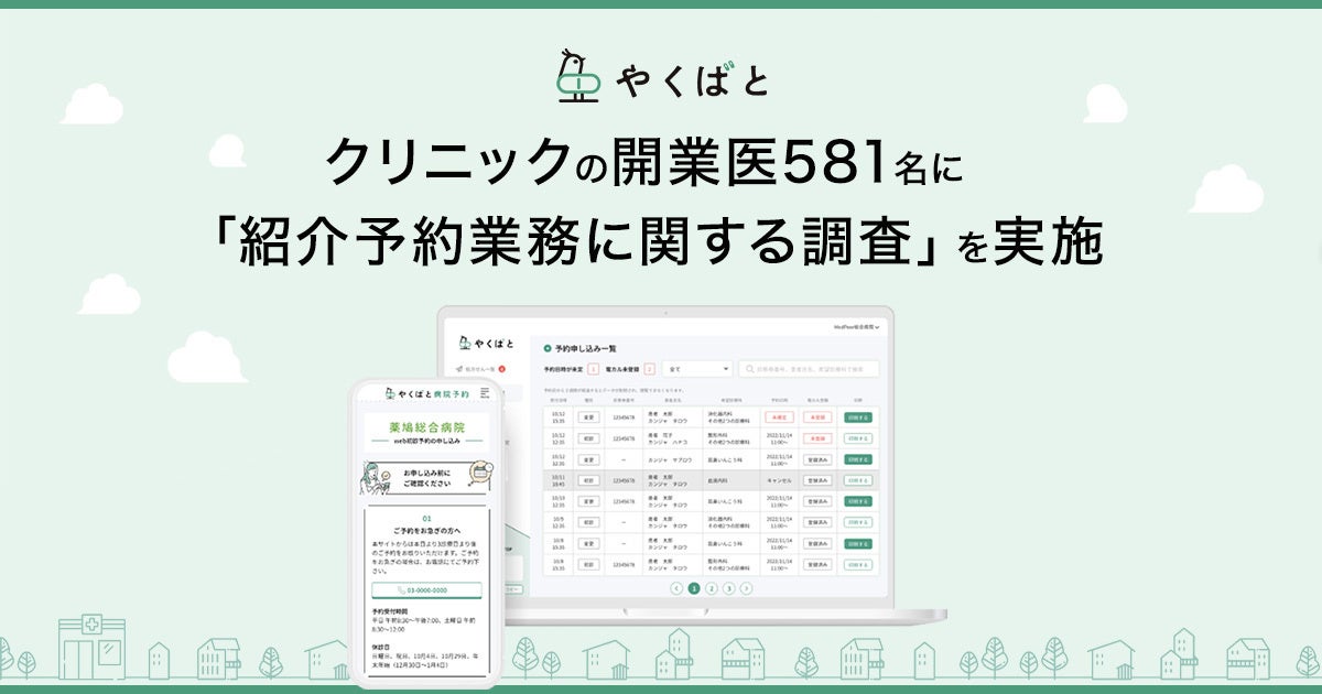 メドピア株式会社(東京都中央区、代表取締役社長 CEO:石見 陽、以下メドピア)が運営する基幹病院・中核病院向けのWeb予約申し込みシステム「やくばと病院予約」は、保険診療を行っているクリニックの開業医581名を対象に「紹介予約業務に関する調査」を実施しました。