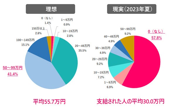 理想の夏のボーナスについて尋ねると、「50~99万円」が41.4%と最も多い結果となりました。平均金額は55.7万円で、実際に2023年夏に支給された人の平均30.0万円と比較すると25.7万円のギャップがあります。