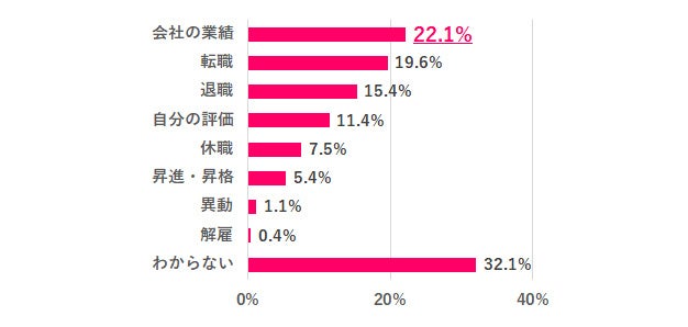 金額差があった人にその要因を尋ねると、「わからない」が32.1%と最も多い結果でした。「わからない」を除くと、1位「会社の業績」22.1%、2位「転職」19.6%、3位「退職」15.4%という順位でした。