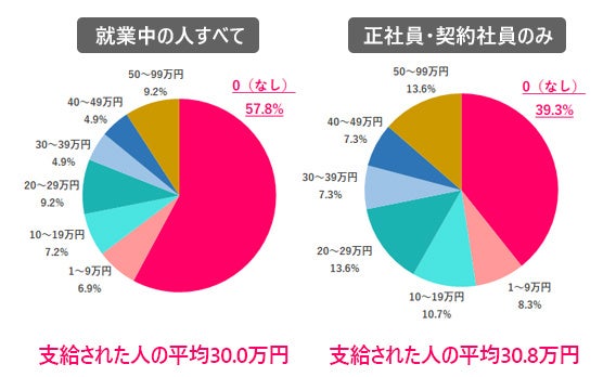 支給された人の平均金額は、「就業中の人すべて」は30.0万円で、「正社員・契約社員」は30.8万円でした。